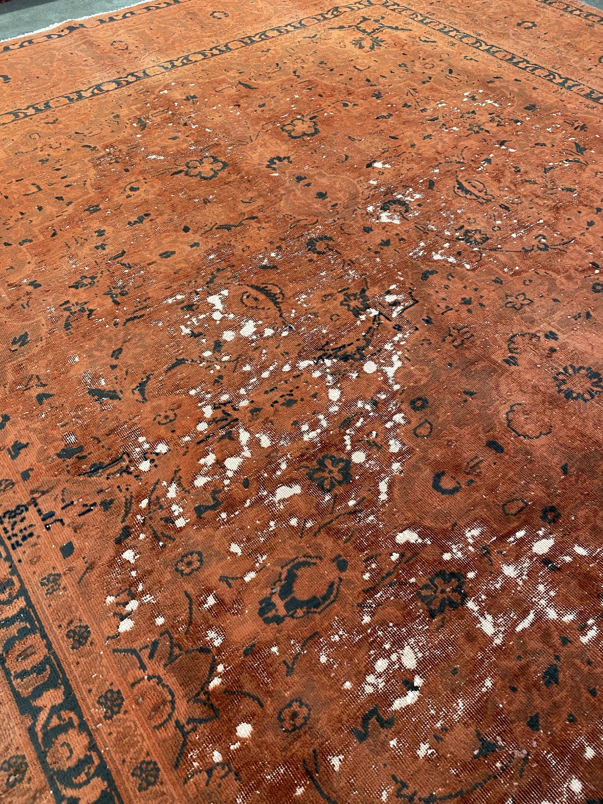 A CONTEMPORARY PERSIAN TABRIZ OVER- DYED WOOLEN RUG. CREATED FROM AN OLD HANDKNOTTED PERSIAN TABRIZ RUG. WITH A CENTRAL MEDALLION IN A FIELD OF PALMETTES AND FLORAL SPRAYS. THE RUG IS HAND-DYED IN TONES OF RUST TERRACOTTA WITH CHARCOAL HIGHLIGHTS. ORIGIN: IRAN (384 X 281 CM) (PLEASE NOTE THERE MAY BE SOME COLOUR VARIATION FROM PHOTOGRAPH)