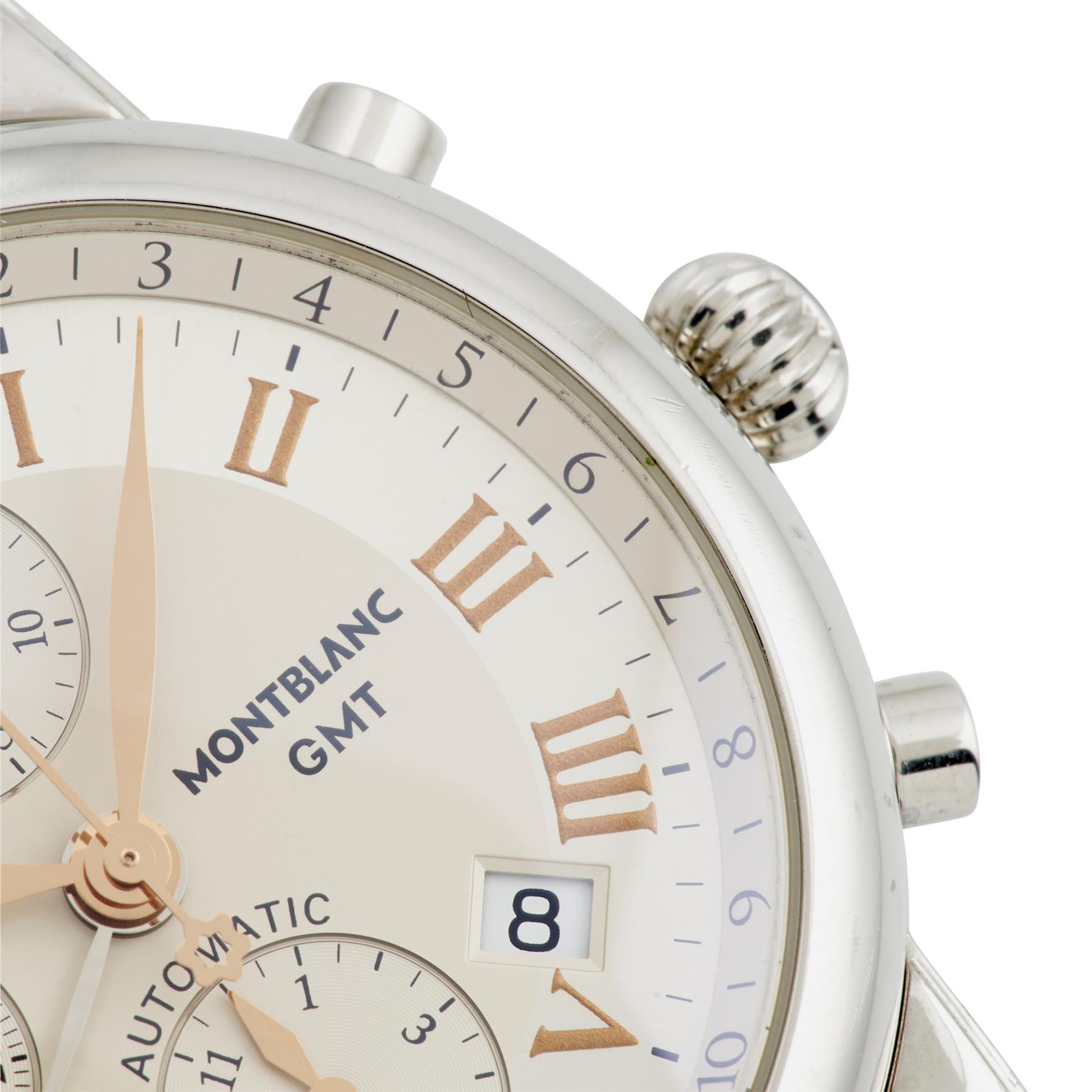 Dial: silvered, applied Roman numerals, date aperture between 4 and 5, polished feuille hands, arrow tipped dual time hand
