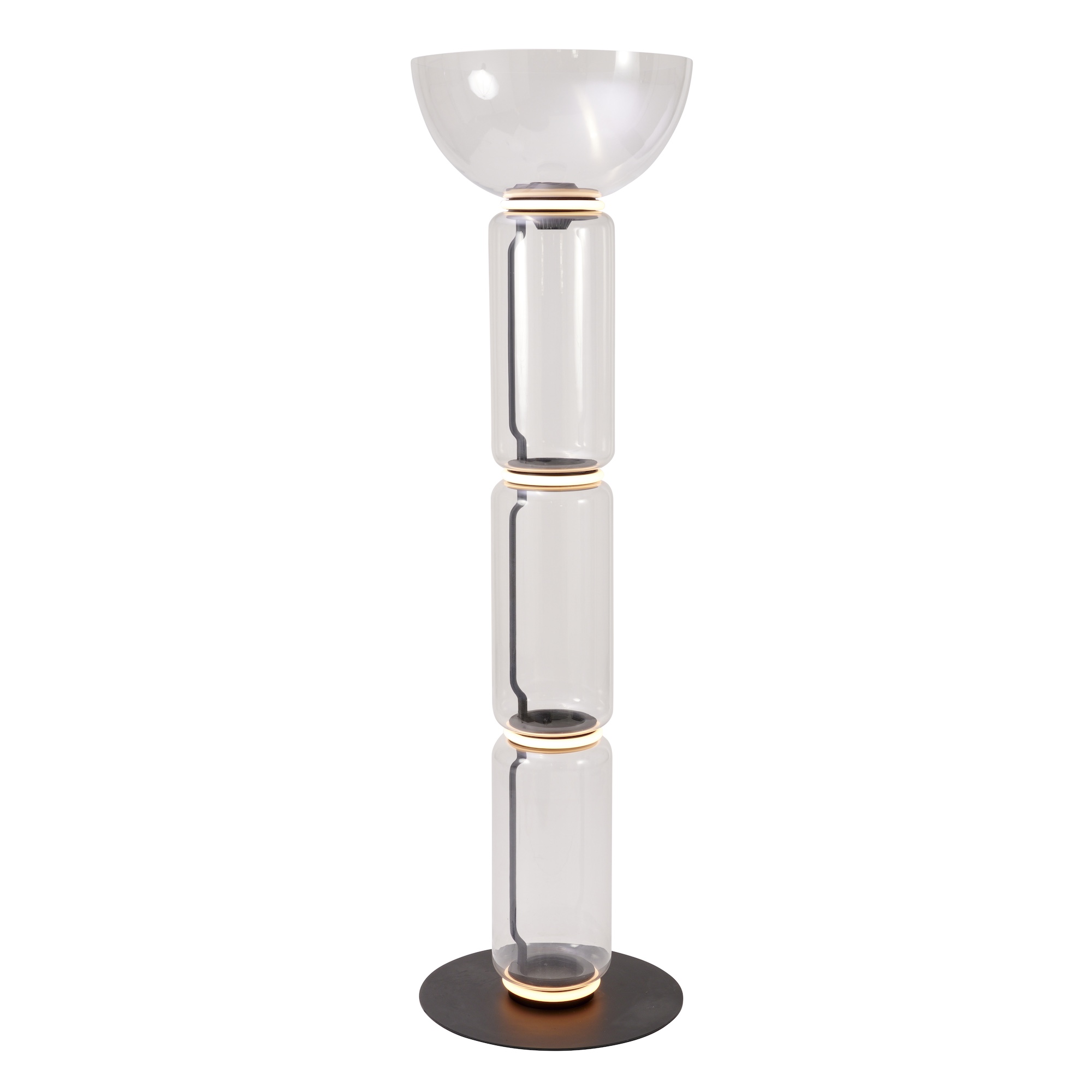 Three stacked transparent glass cylinders surmounted by glass hemisphere on circular steel base. Dimmable LED illumination rings between modules.