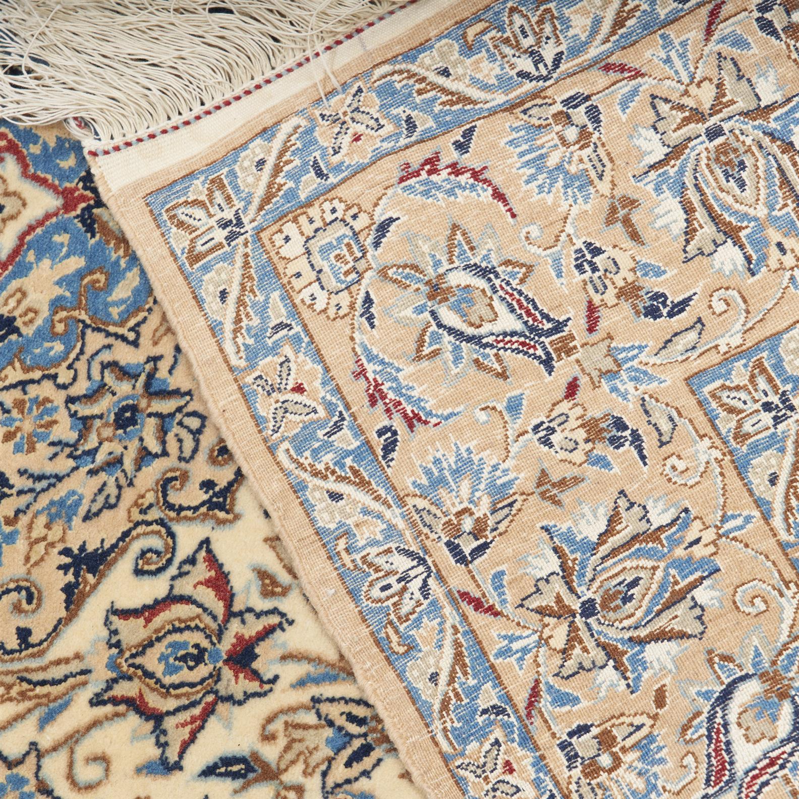 The whole in blues, browns, and other colours on a cream ground, the field with a small shaped floral medallion within an all-over design of flowering foliage, the border of floral designs