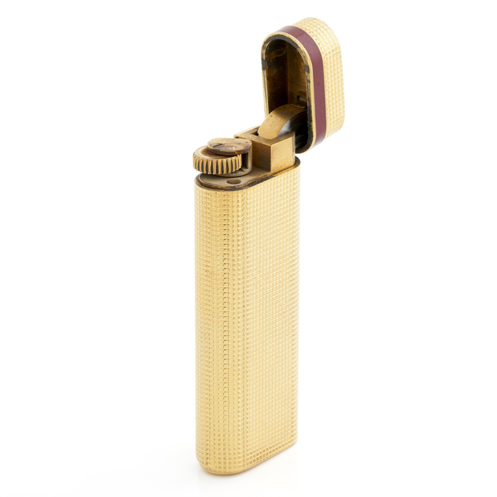 CARTIER, A VINTAGE LIGHTER STYLED IN ENAMEL AND GOLD TONE METAL, TOGETHER WITH A PARCEL OF ADDITIONAL LIGHTER FLINT, ACCOMPANIED BY A DUSTBAG AND FITTED BOX