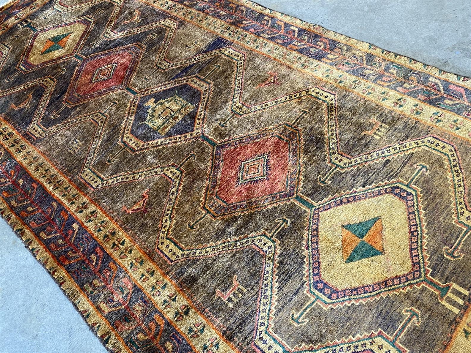 A NOMADIC PERSIAN JOKAR HAND-SPUN WOOL RUG WITH ALL VEGETABLE DYES. NATURAL ABRASH DISCOLORATION. NOMADIC DESIGN OF REPEATING HEXAGONAL MEDALLIONS IN A CARAMEL- TONED FIELD OF BIRD AND DOG FORMS. BORDER OF TREE OF LIFE PATTERNS. CERTIFICATE OF AUTHENTICITY ORIGIN ON REQUEST. IN GOOD CLEAN CONDITION. ORIGIN: IRAN (291 X 141 CM) (PLEASE NOTE THERE MAY BE SOME COLOUR VARIATION FROM PHOTOGRAPH)