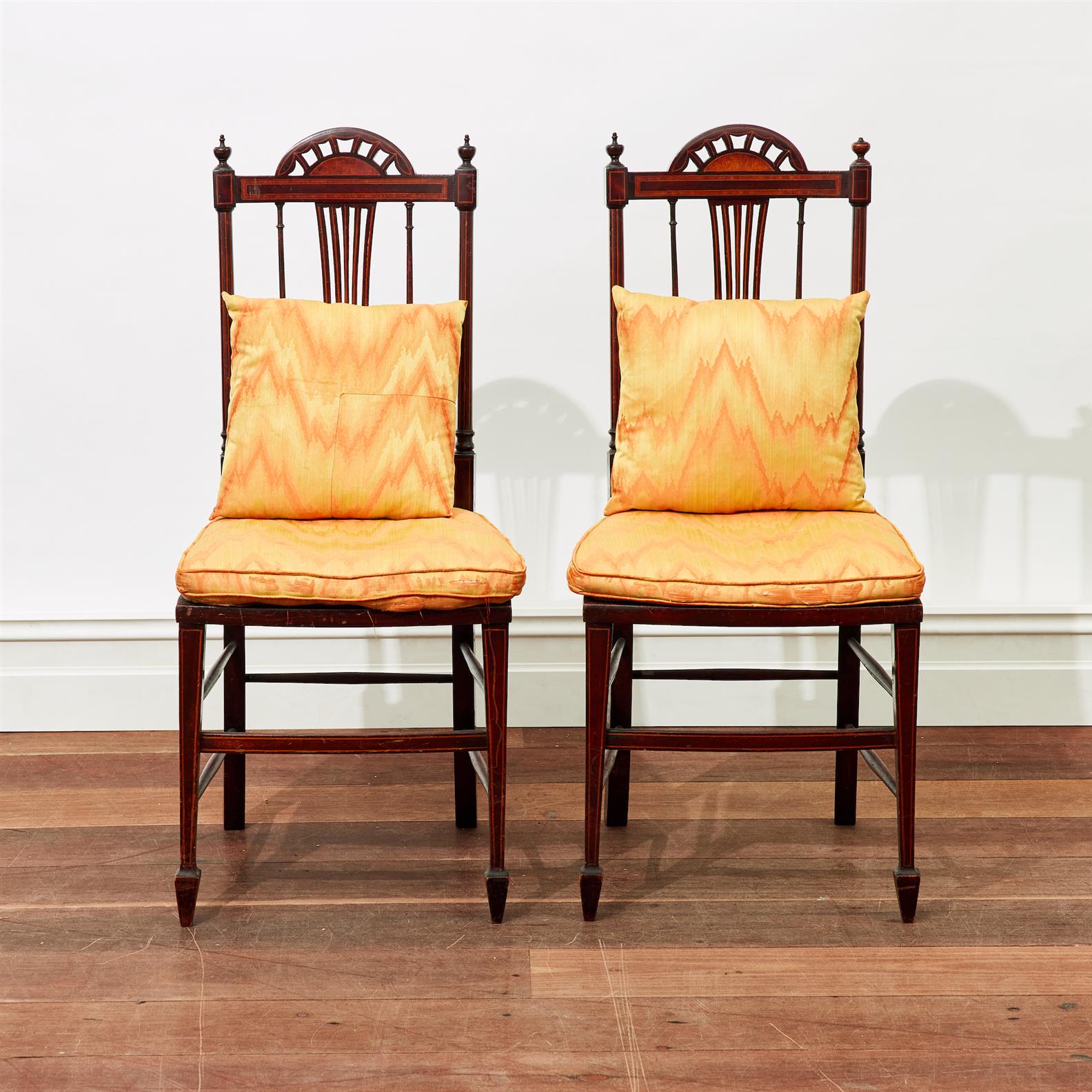 A PAIR OF EDWARDIAN INLAID BEDROOM CHAIRS IN THE SHERATON STYLE WITH SLENDER PIERCED SPLATS AND PADDED SEATS (2)