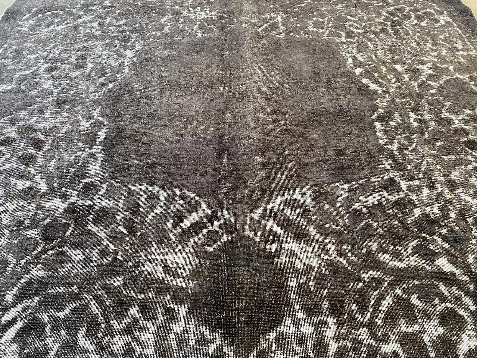AN OVER-DYED PERSIAN TABRIZ RUG. CREATED FROM AN OLD PERSIAN TABRIZ RUG WITH A BOLD MEDALLION DESIGN. THE PILE IS SHORN AND HAND-DYED IN SHADES OF CHARCOAL CREAM. CERTIFICATE OF AUTHENTICITY AND ORIGIN ON REQUEST. ORIGIN: IRAN (337 X 242 CM) (PLEASE NOTE THERE MAY BE SOME COLOUR VARIATION FROM PHOTOGRAPH)
