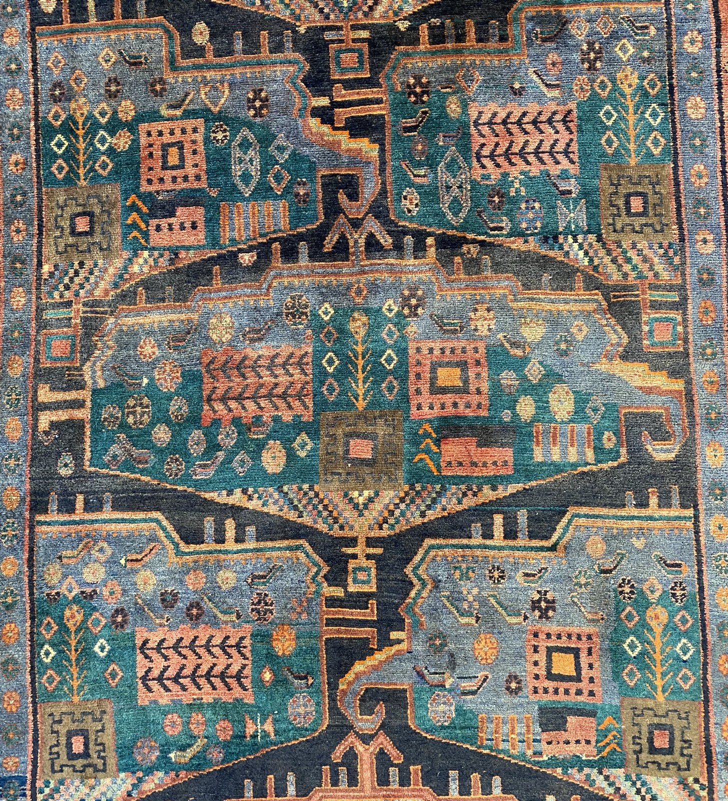 AN ANTIQUE BIDJAR HAND-SPUN WOOL ENTRANCE RUG WITH NATURAL DYES. RARE DESIGN OF REPEATING MEDALLIONS AND SEMI-MEDALLIONS CONTAINING GEOMETRIC PATTERNS AND TREE OF LIFE MOTIFS. MINOR BORDERS OF FLOWER HEADS. THE ENTIRE IN SHADES OF CHARCOAL, BLUE, EMERALD GREEN AND TERRACOTTA. PROFESSIONALLY RESTORED AND IN EXCELLENT CONDITION. ORIGIN: IRAN (392 X 157 CM) (PLEASE NOTE THERE MAY BE SOME COLOUR VARIATION FROM PHOTOGRAPH)