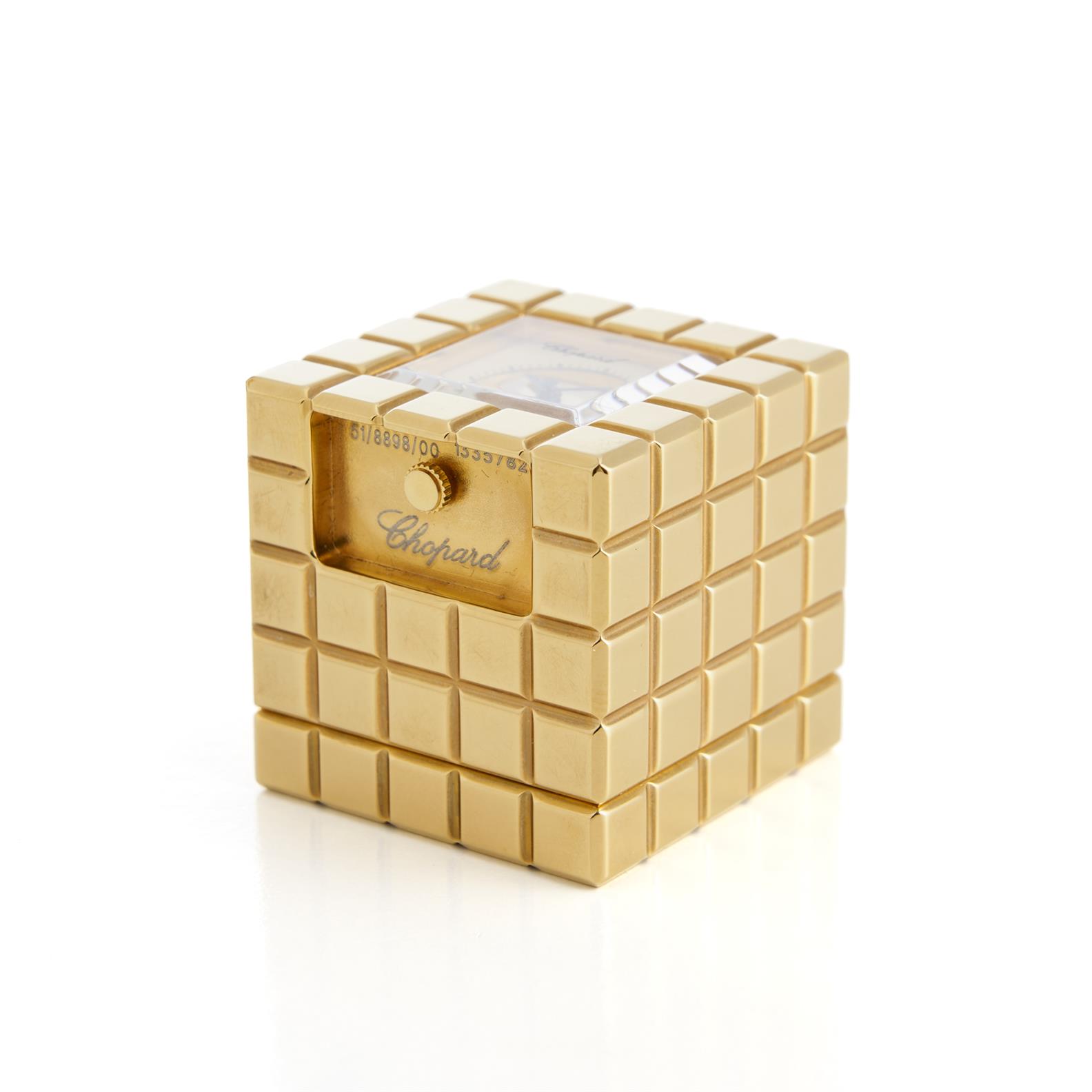 CHOPARD, AN 'ICE CUBE' ALARM CLOCK STYLED IN GOLD TONE METAL, 3.5 X 3.5 X 3.5CM, ACCOMPANIED BY A FITTED BOX