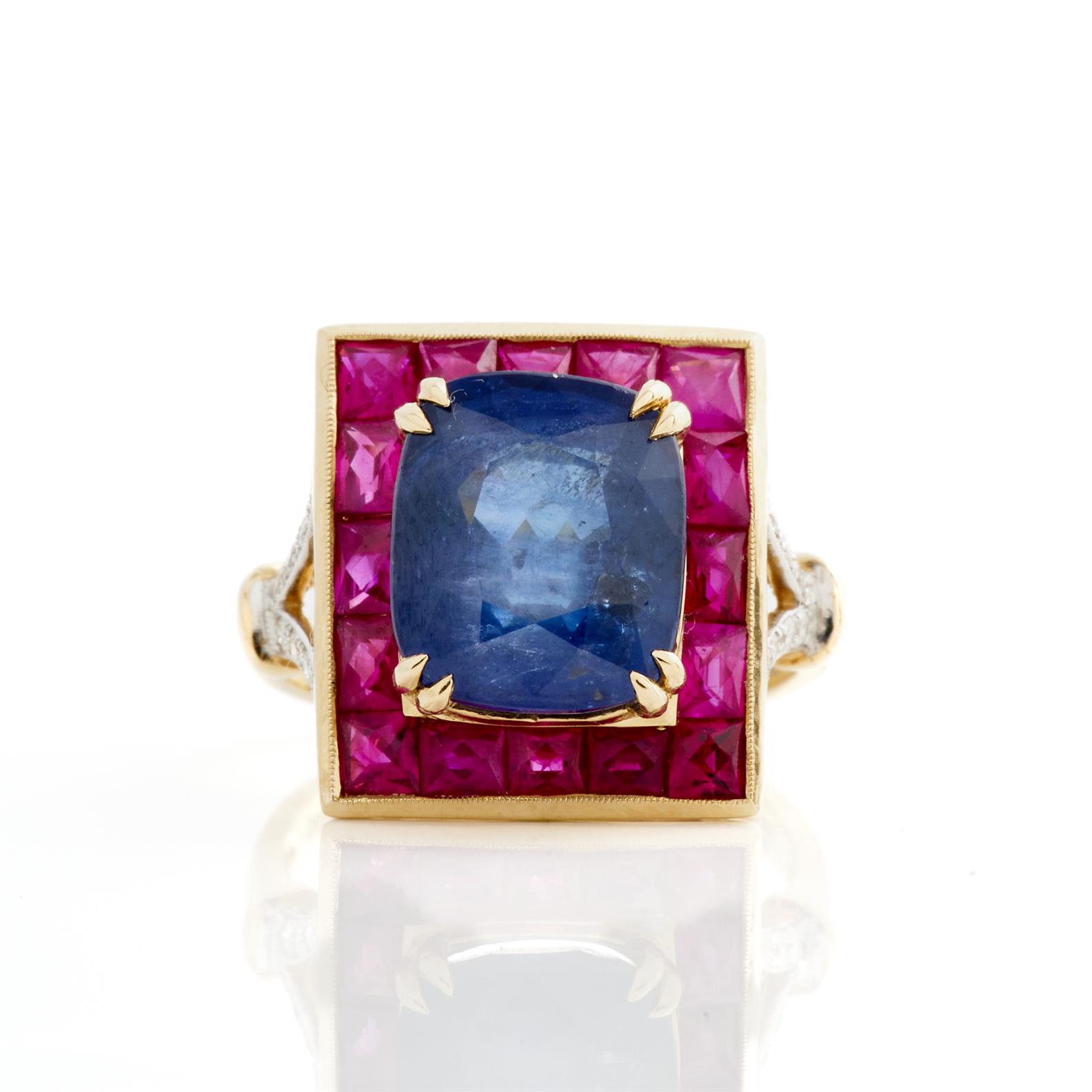 A SAPPHIRE, RUBY AND DIAMOND RING IN 14CT GOLD, THE SAPPHIRE WEIGHING 6.31CTS, THE RUBIES TOTALLING 1.78CTS, THE DIAMONDS TOTALLING 0.14CTS, SIZE M, 5.1GMS