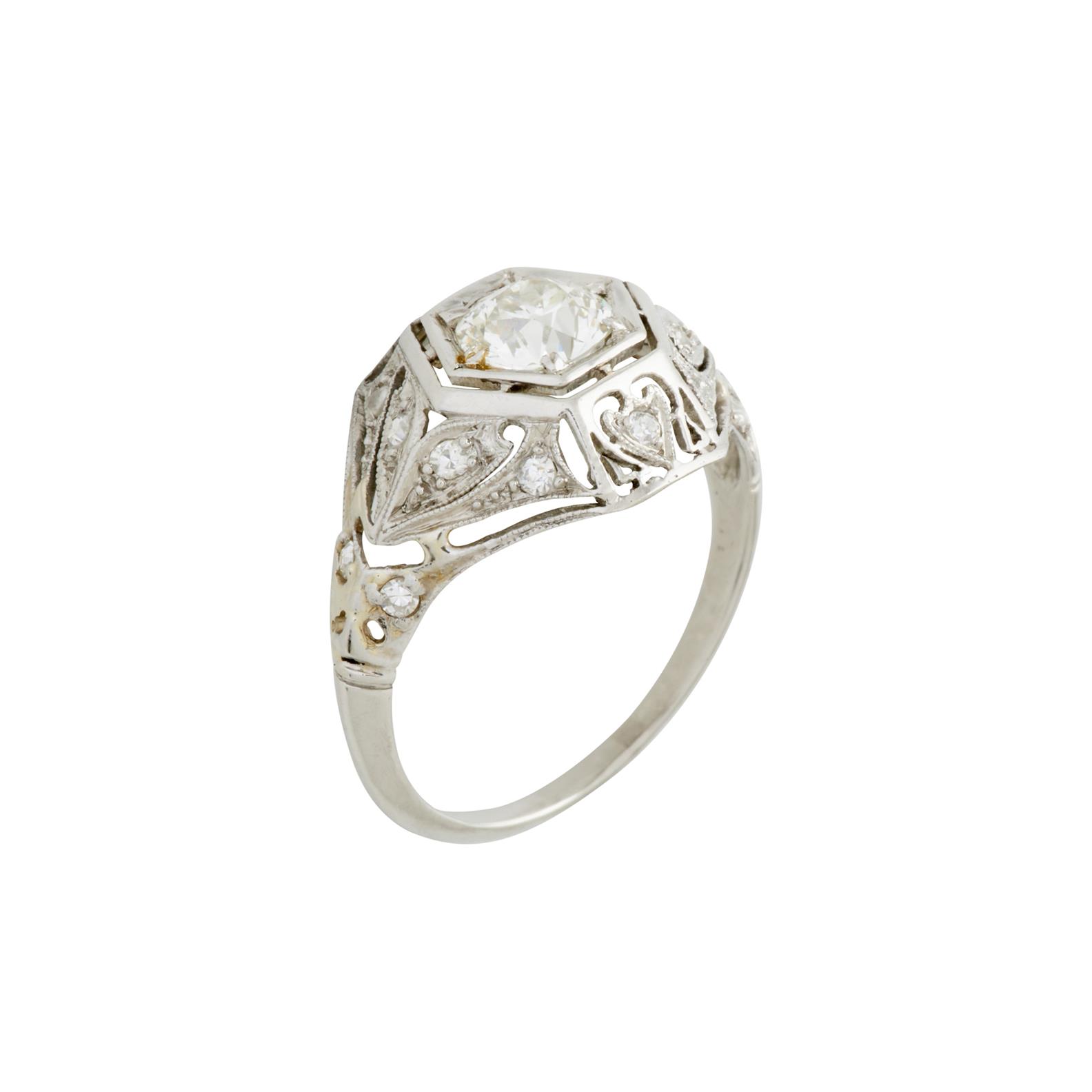 Centring a claw-set old European-cut diamond weighing approximately 0.65 carats, within an ornate pierced surround accented with single-cut diamonds, the small diamonds together weighing approximately 0.15 carats, mounted in platinum, size L, gross weight approximately 3.1 grams.