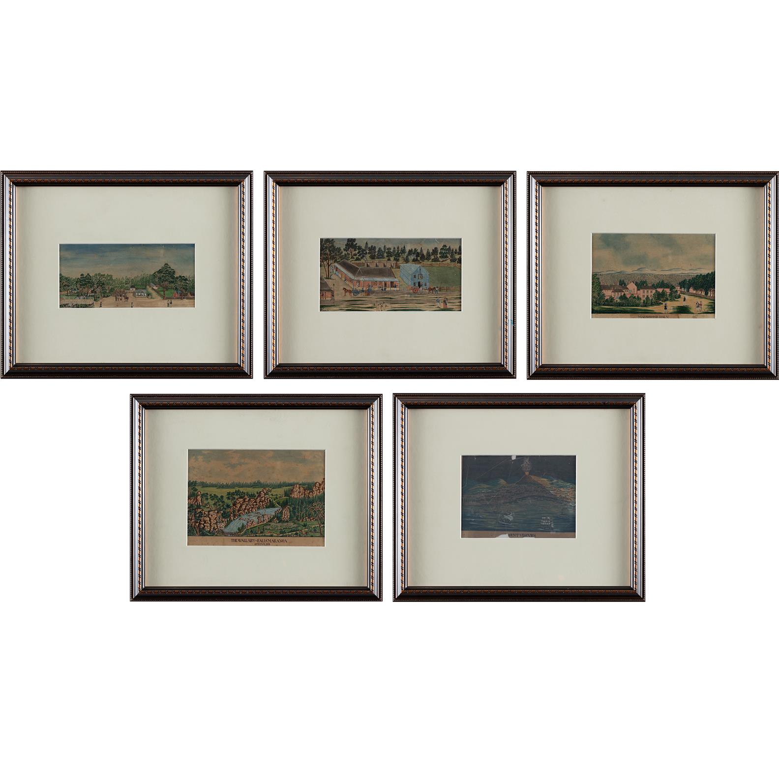 (i) 10.5 x 22.5cm (ii) 12 x 23.5cm (iii) 14 x 20.5cm (iv) 16 x 22.5cm (v) 13.5 x 19cm (Each 34.5 x 42cm framed)
