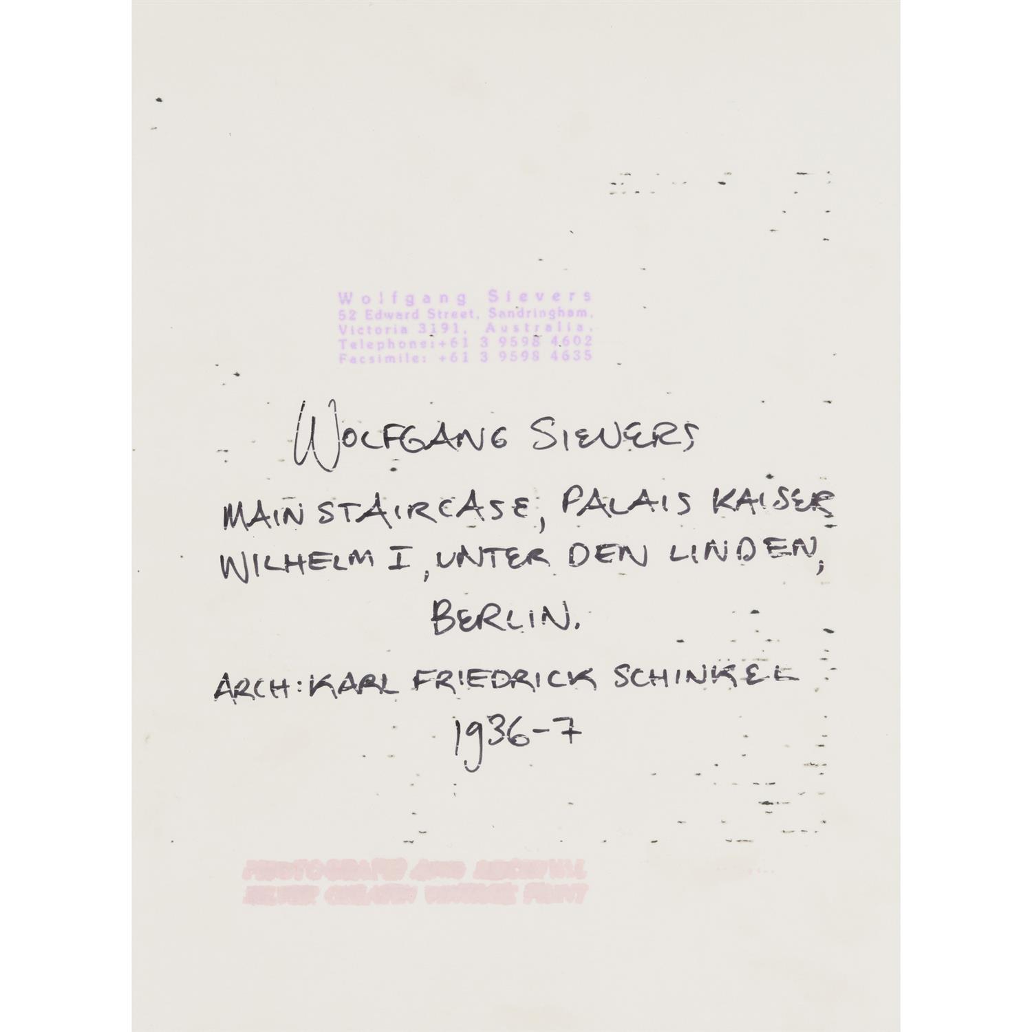 signed, dated and inscribed verso: WOLFGANG SIEVERS/ MAIN STAIRCASE, PALAIS KAISER/ WILHELM I, UNTER DEN LINDEN,/ BERLIN./ ARCH: KARL FRIEDRICH SCHINKEL/ 1936-7