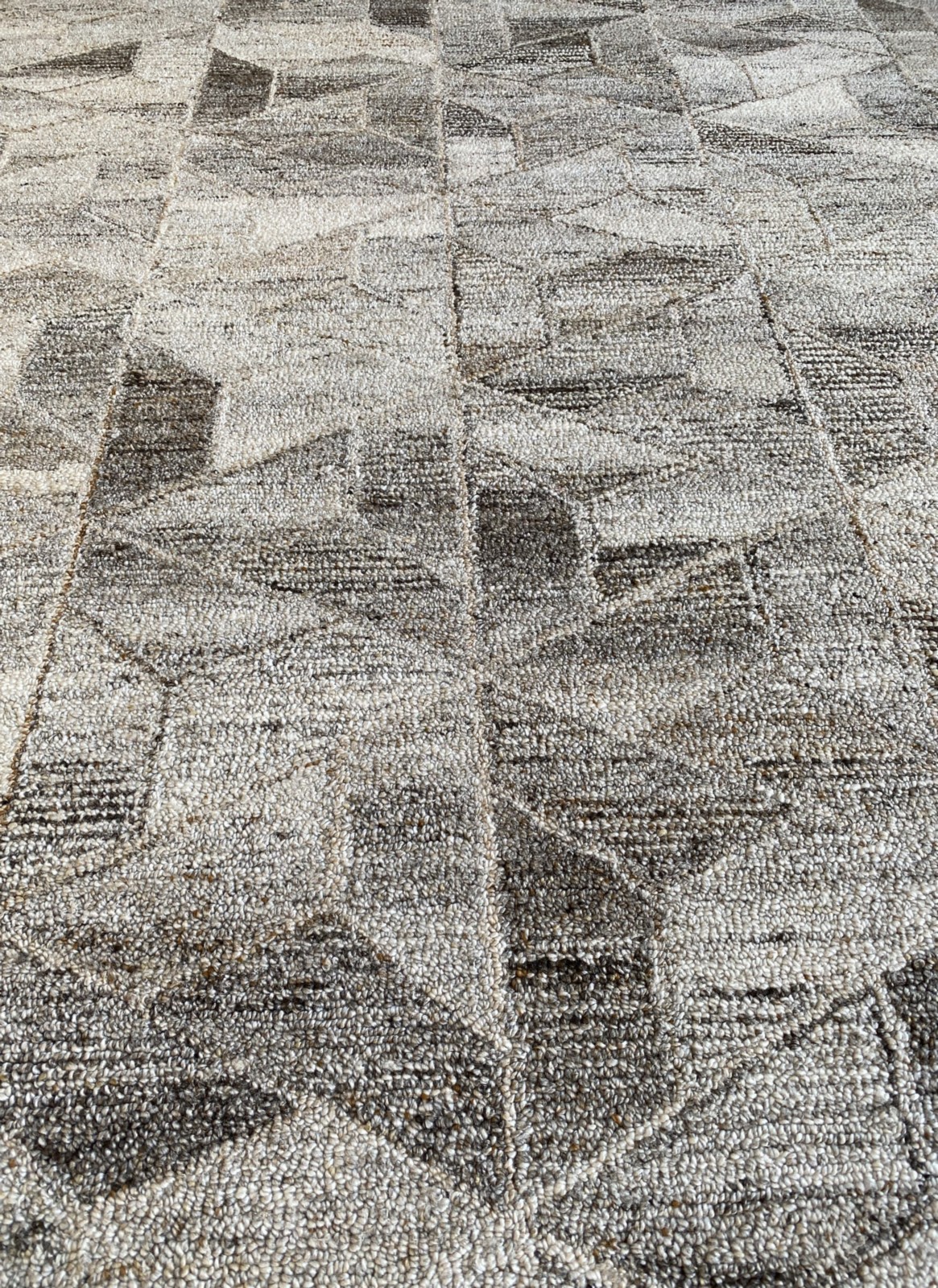 A NEW CONTEMPORARY MOSAIC DESIGN WOOL RUG. HANDLOOM WEAVE. IN SHADES OF SILVER, CHARCOAL & TAUPE. IN EXCELLENT CONDITION. ORIGIN: INDIA (303 X 244 CM) (PLEASE NOTE THERE MAY BE SOME COLOUR VARIATION FROM PHOTOGRAPH)