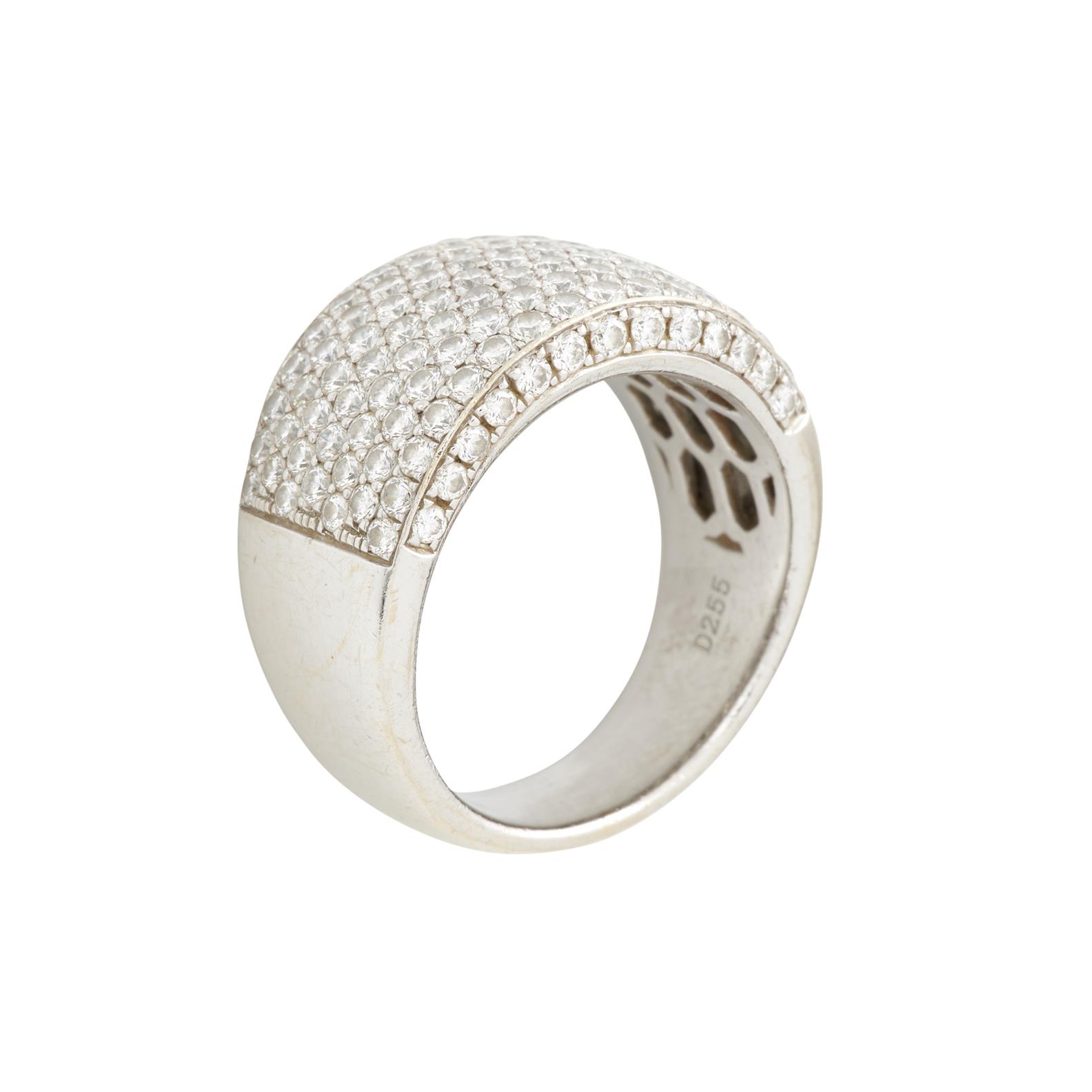 The domed profile dress ring pave set to the top with brilliant-cut diamonds, together weighing approximately 2.55 carats, measuring 12.7 mm wide at the top and tapering down to 6.4 mm at the lower shank, size P,