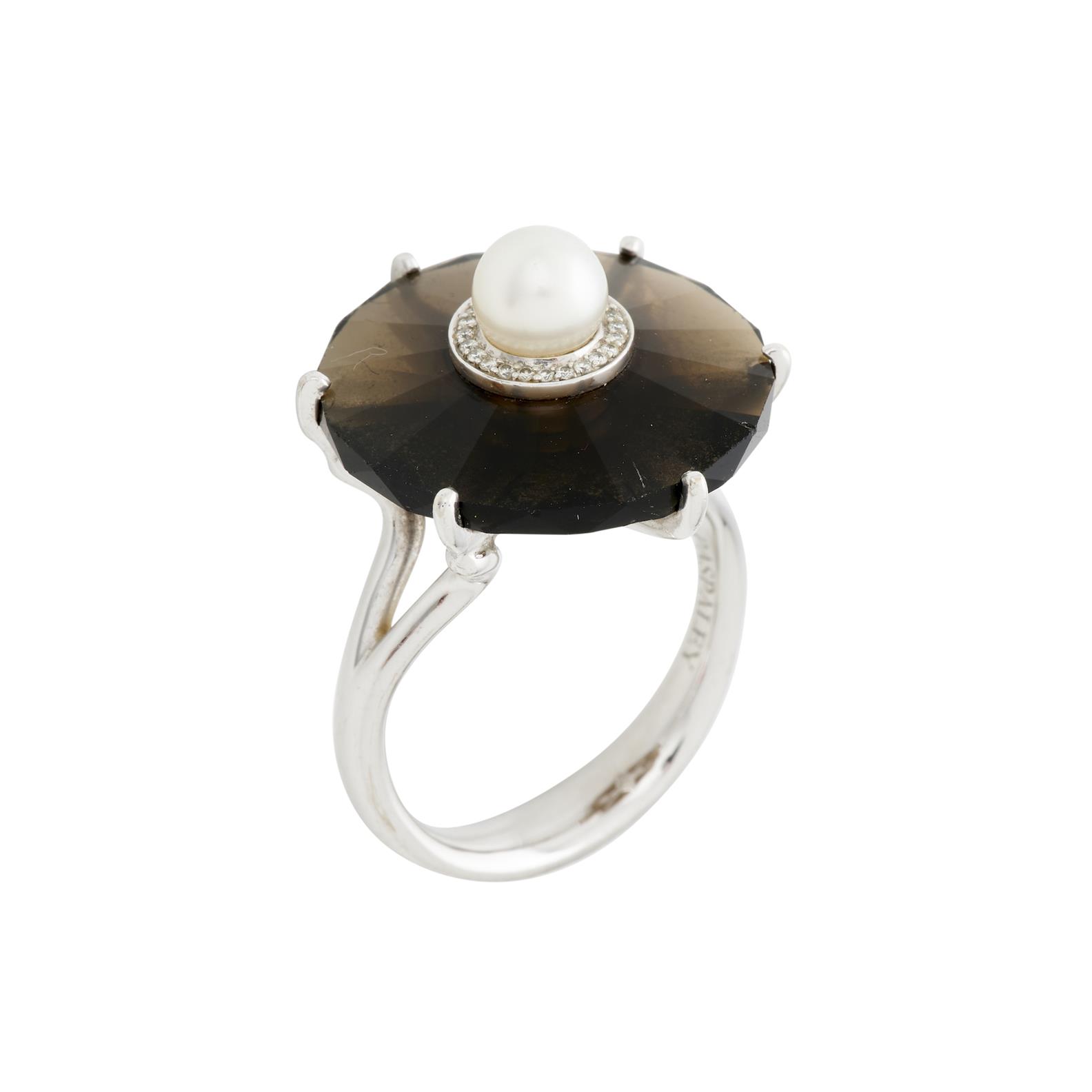 PASPALEY, WHITE GOLD, PEARL DIAMOND AND SMOKEY QUARTZ PLAQUE RING