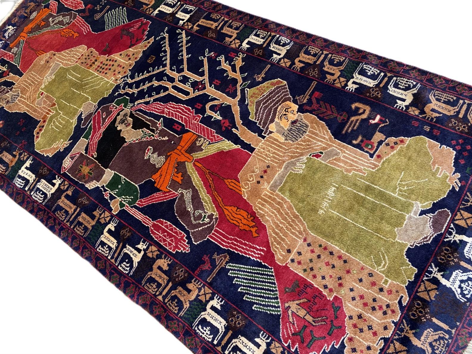 A TRIBAL KHAYYAM DESIGN FERDOWS WOOL RUG. HAND-KNOTTED IN MEMORANDUM & DATED 1934 TO 1992. PICTORIAL KHAYYAM DESIGN OF WOMAN BEARING AN AMPHORA OF WINE STANDING OVER THE POET IN A BACKGROUND OF TREE OF LIFE PATTERNS PEACOCKS & LIONS. BORDER OF REPEATING DEER FORMS. IN PRISTINE CONDITION. ORIGIN: IRAN (240 X 120 CM) (PLEASE NOTE THERE MAY BE SOME COLOUR VARIATION FROM PHOTOGRAPH)