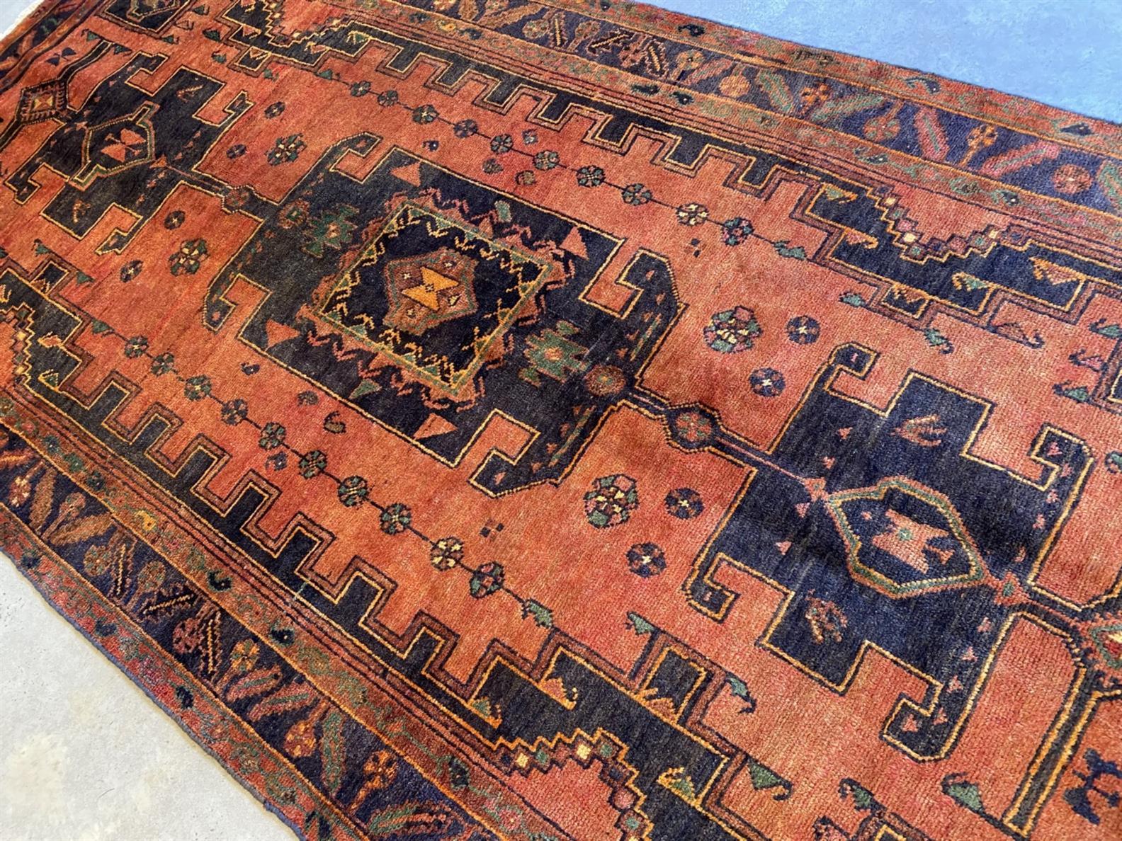 A TRIBAL PERSIAN TAJABAD WOOL ENTRANCE RUG. VILLAGE WEAVE FROM THE NATANZ COUNTY IN THE ISFAHAN PROVINCE, WITH TRIBAL DESIGN OF BOLD ANCHORED MEDALLION SET WITHIN A TERRACOTTA-TONED FIELD OF SECONDARY FLORAL PATTERNS. BORDER OF ROSETTES AND LEAVES. IN EXCELLENT CONDITION. ORIGIN: IRAN (290 X 146 CM) (PLEASE NOTE THERE MAY BE SOME COLOUR VARIATION FROM PHOTOGRAPH)