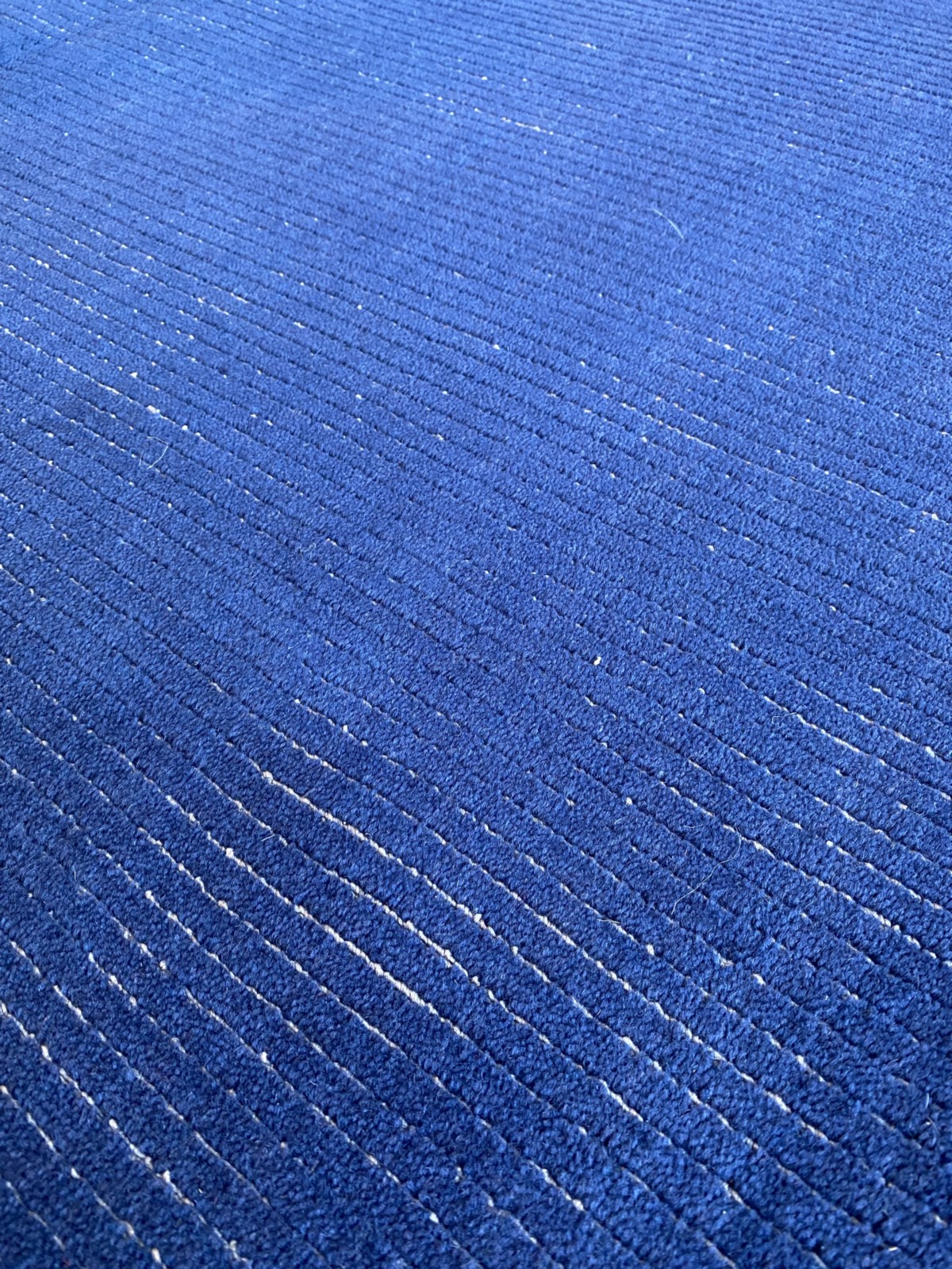 A NEW LARGE WOOL RUG. LOOM KNOTTED MIDNIGHT BLUE-TONED PILE WITH BEIGE SILK TEXTURED LOOPS THROUGHOUT. ORIGIN: INDIA (400 X 300 CM) (PLEASE NOTE THERE MAY BE SOME COLOUR VARIATION FROM PHOTOGRAPH)