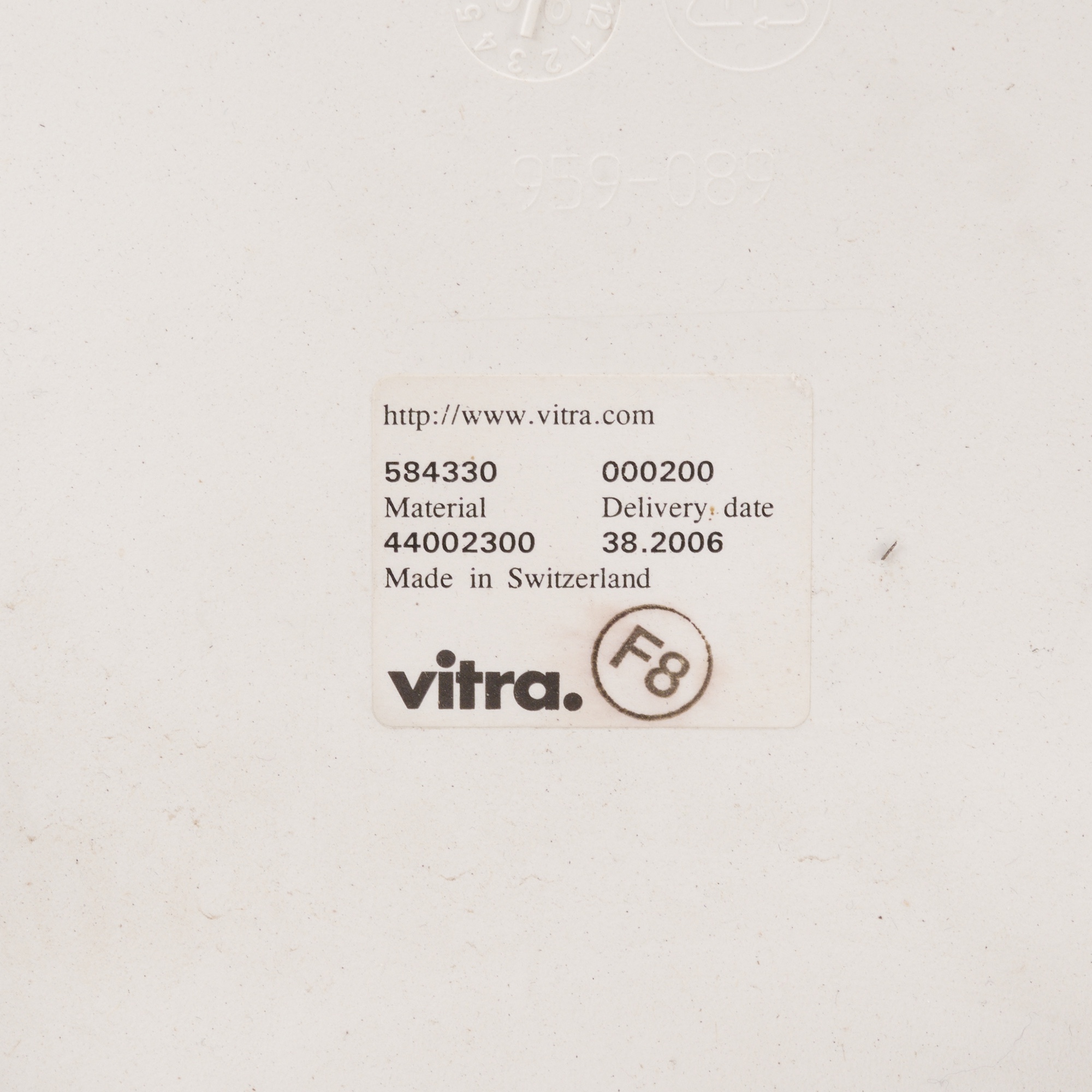 White moulded plastic seat shells on wooden base. Vitra mark to undersides.