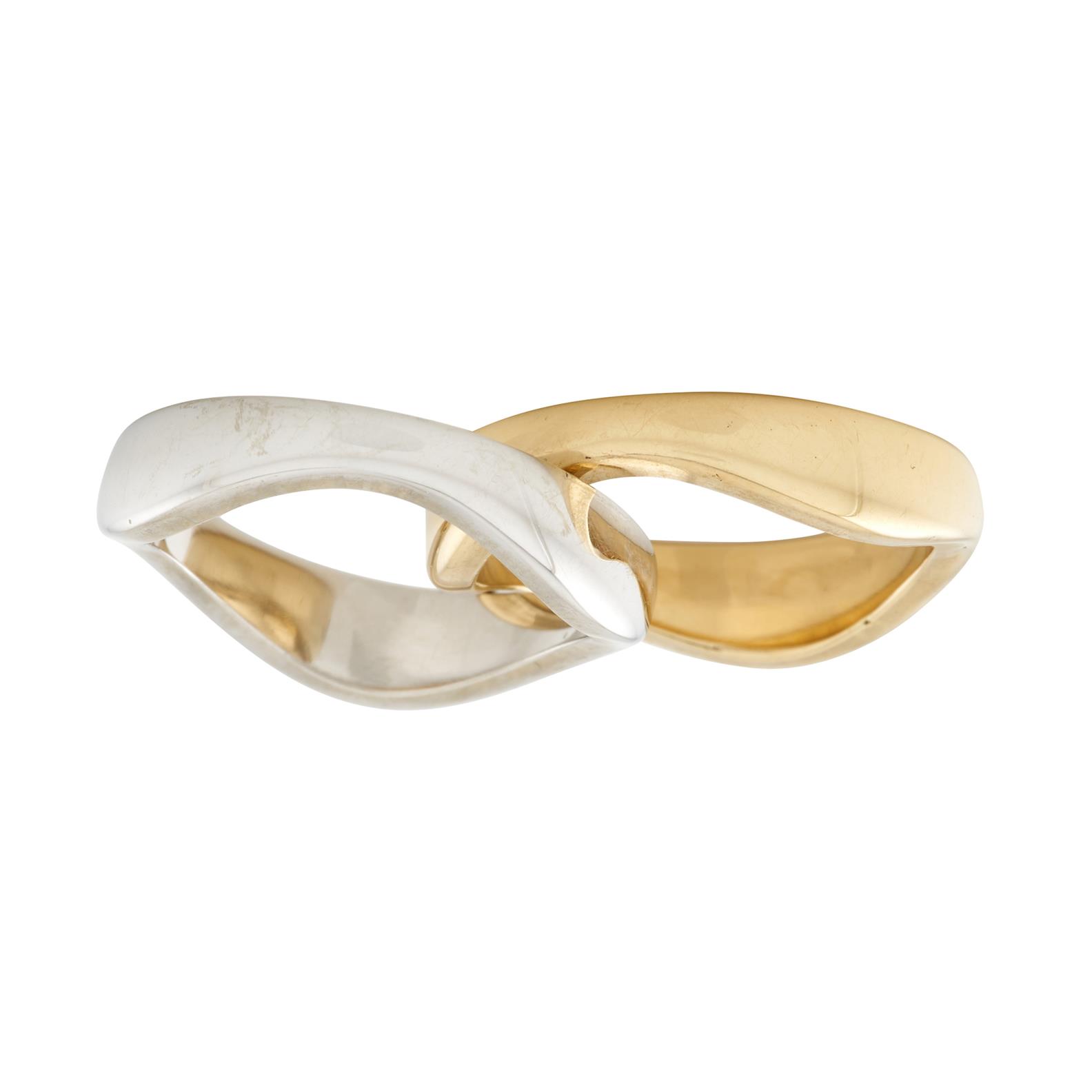 Designed with straight outer edges and wave shaped interiors to fit together and worn as one piece, one band crafted in 18ct yellow gold, the other in 18ct white gold, ring size I,