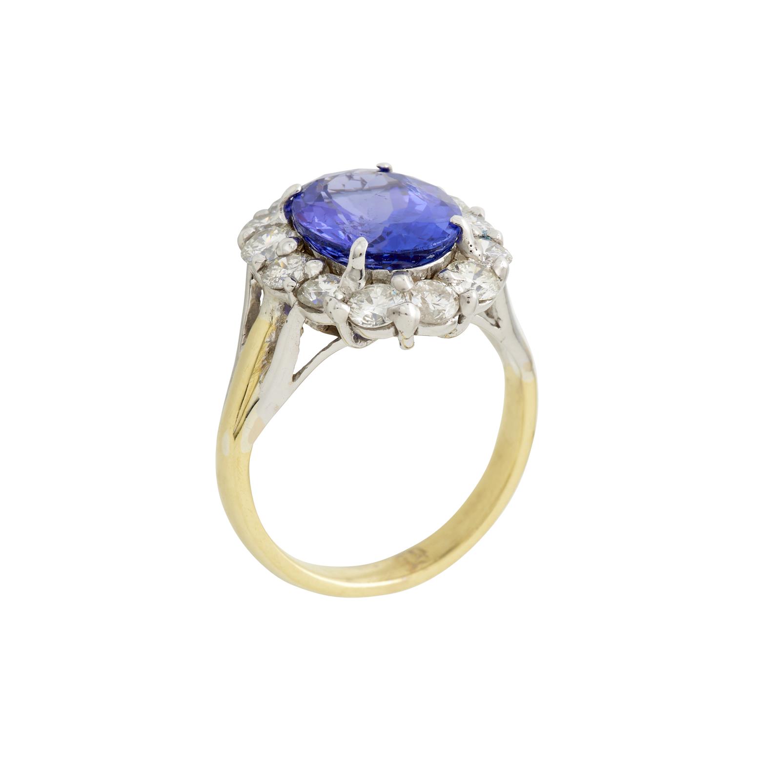 A TANZANITE AND DIAMOND RING IN 18CT GOLD, TANZANITE TOTALLING 4.32CT, DIAMONDS TOTALLING 1.9CTS, SIZE N, 7.2GMS