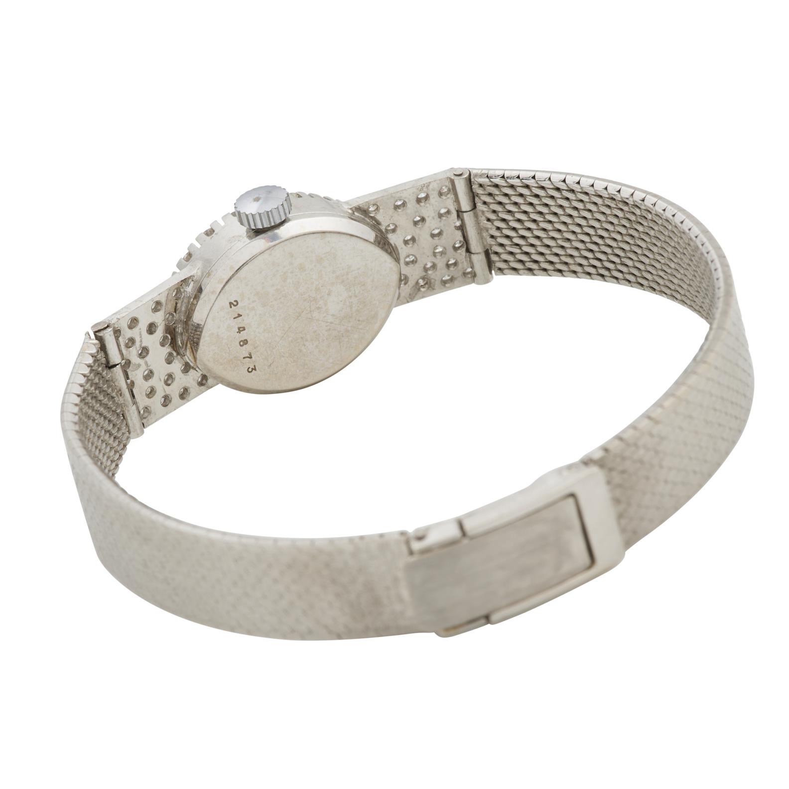 Case: polished navette, diamond-set bezel, between pave-set diamond sholuders, snap on case back, no. 214873