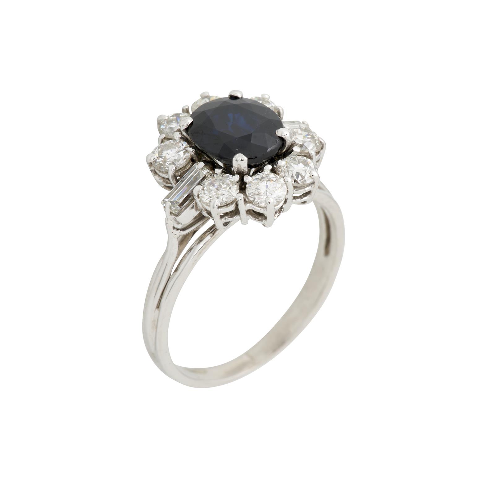 Of cluster design centring on a faceted oval blue sapphire surrounded by round brilliant cut diamonds and flanked at each shoulder by baguette diamonds, size L,