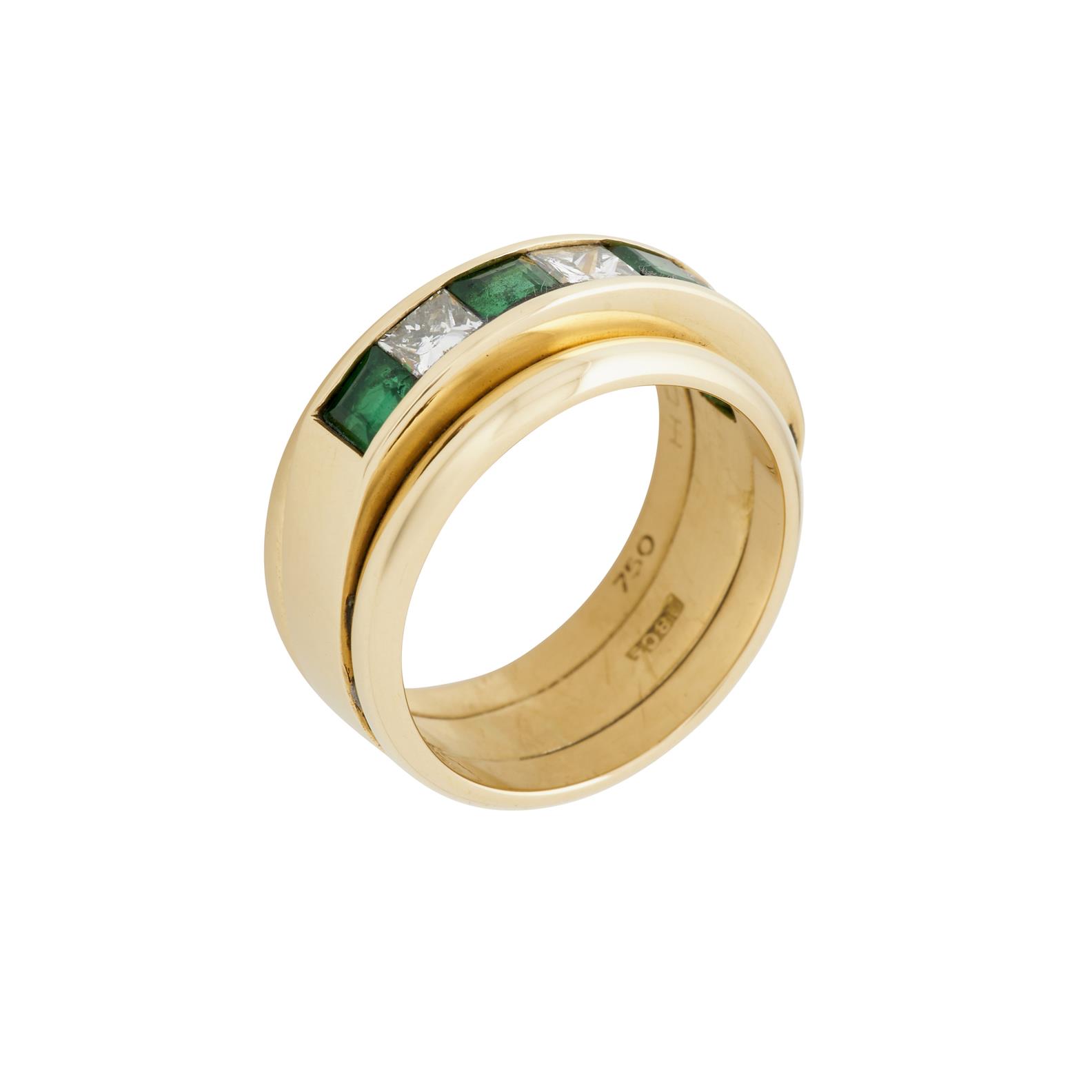 Set of three yellow gold rings fused together as one channel set with four carre cut emeralds and three princess cut diamonds set alternating, the outer lip-bands having a soft domed profile, size M, gross weight approximately 10.3 grams.