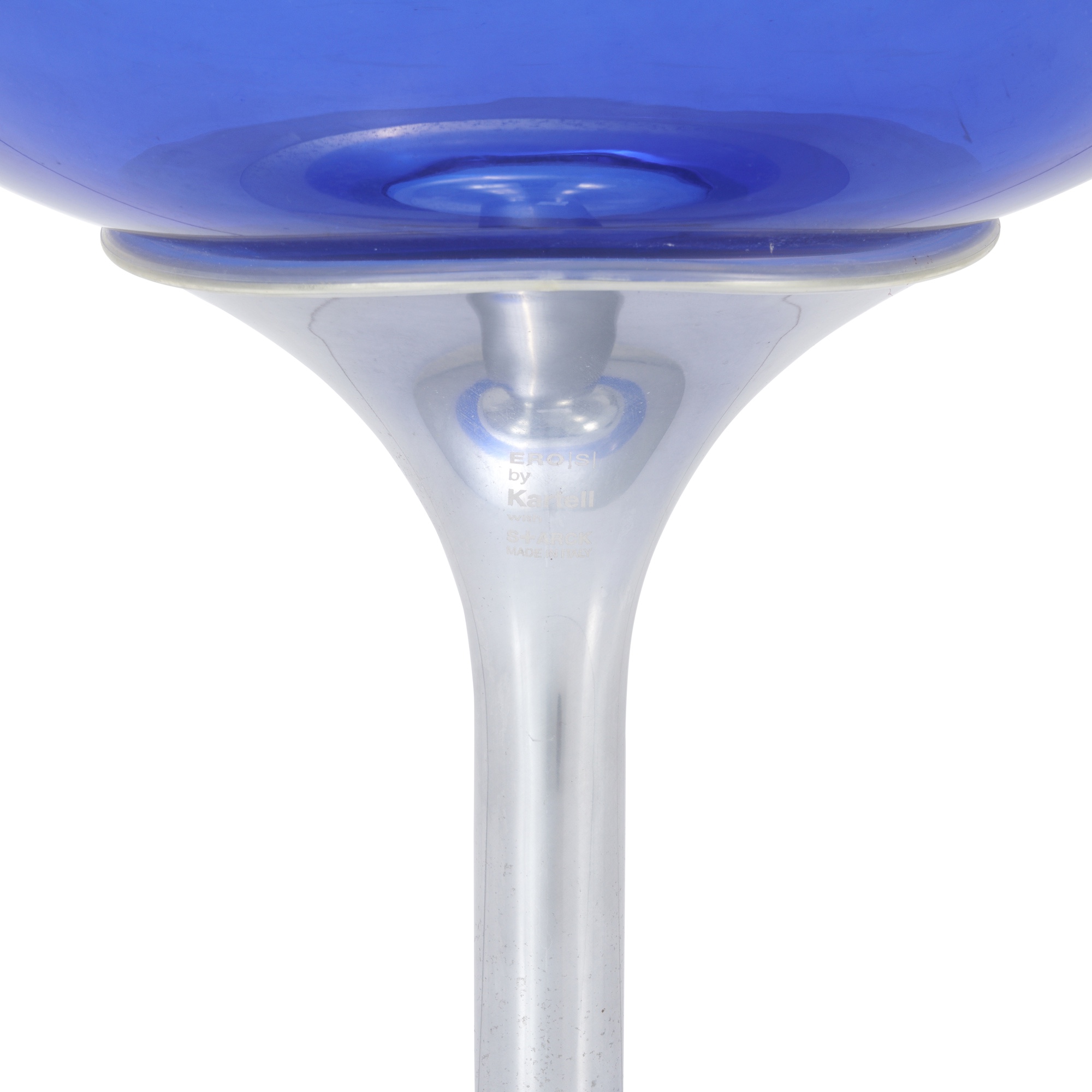 Egg shaped transparent blue polycarbonate seat on aluminium swivel base. Manufacturer details to stem.