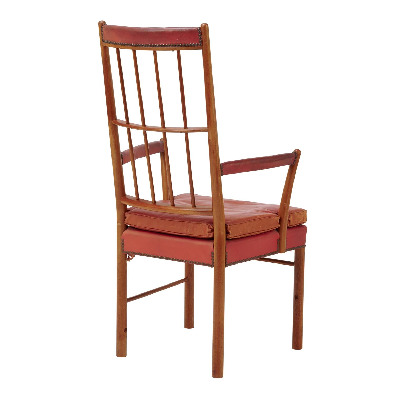 Red leather seat and armrests on mahogany frame.