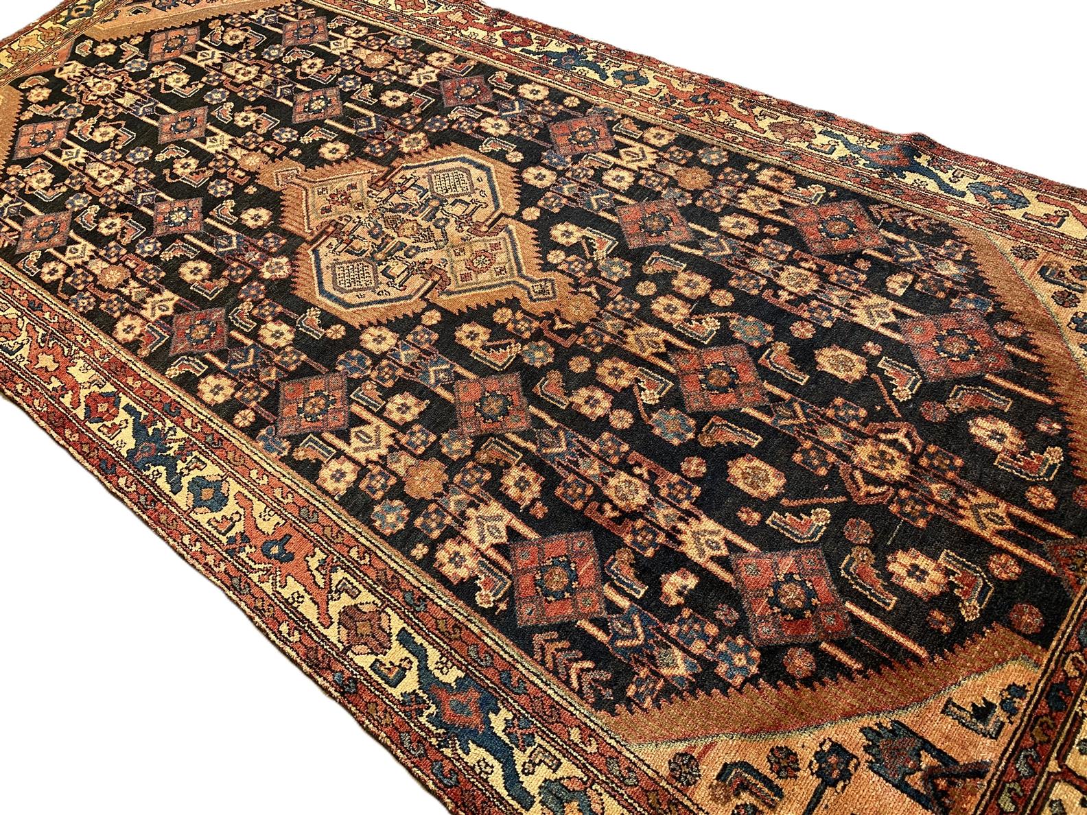 A HARD WEARING WOOLLEN PILE PERSIAN MALAYER ENTRANCE RUG. HAND-KNOTTED VILLAGE WEAVE FROM THE HAMADAN REGION WITH TRIBAL DESIGN OF AN ANGULAR MEDALLION IN A FIELD OF BOLD HERATI MAHI PATTERNS & FLORAL MOTIFS. IN SHADESA OF INDIGO, TERRACOTTA & CREAM. CERTIFICATE OF AUTHENTICITY & ORIGIN ON REQUEST. ORIGIN: IRAN (330L X 152W CM) (PLEASE NOTE THERE MAY BE SOME COLOUR VARIATION FROM PHOTOGRAPH)