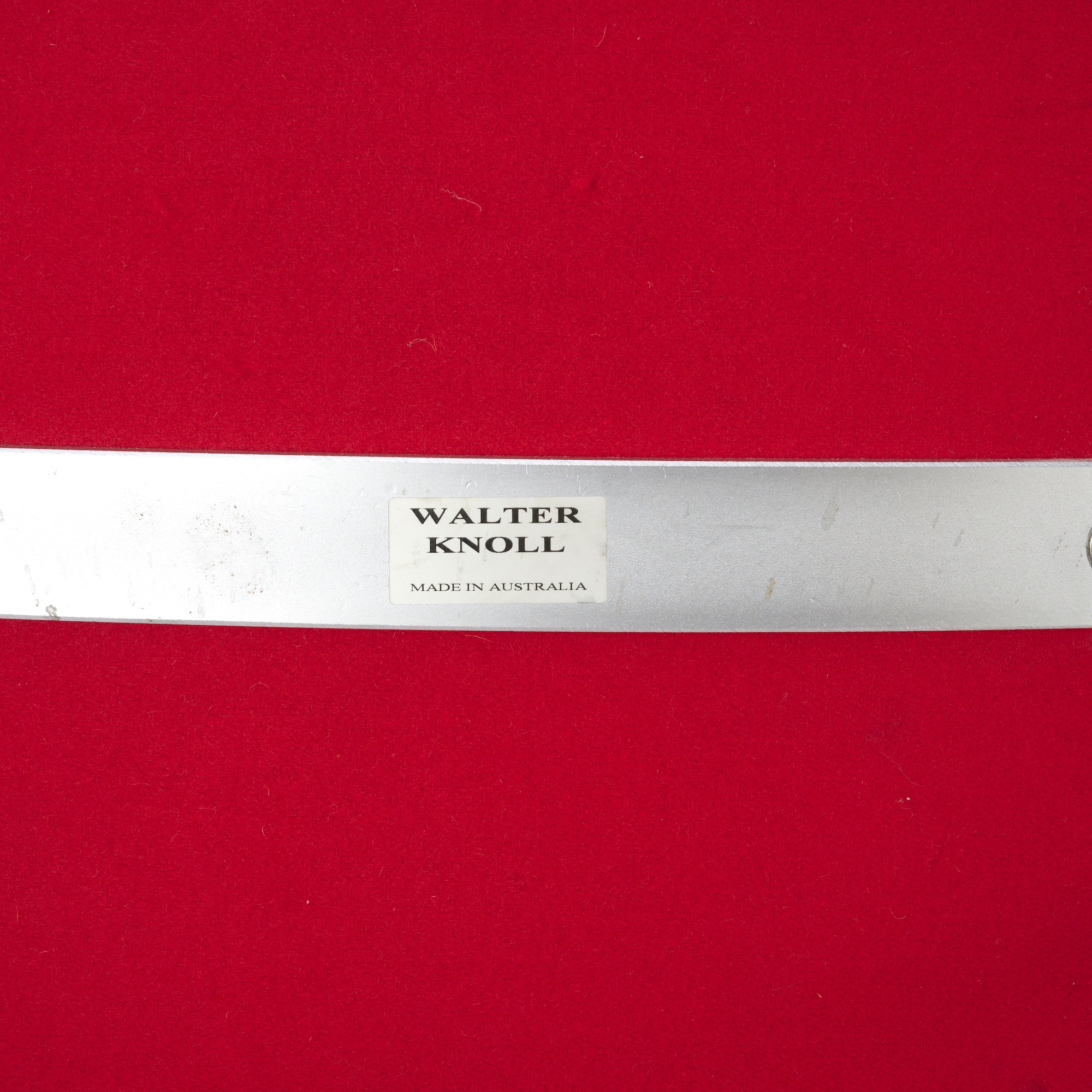 Red wool blend textile upholstery on satin steel frames.