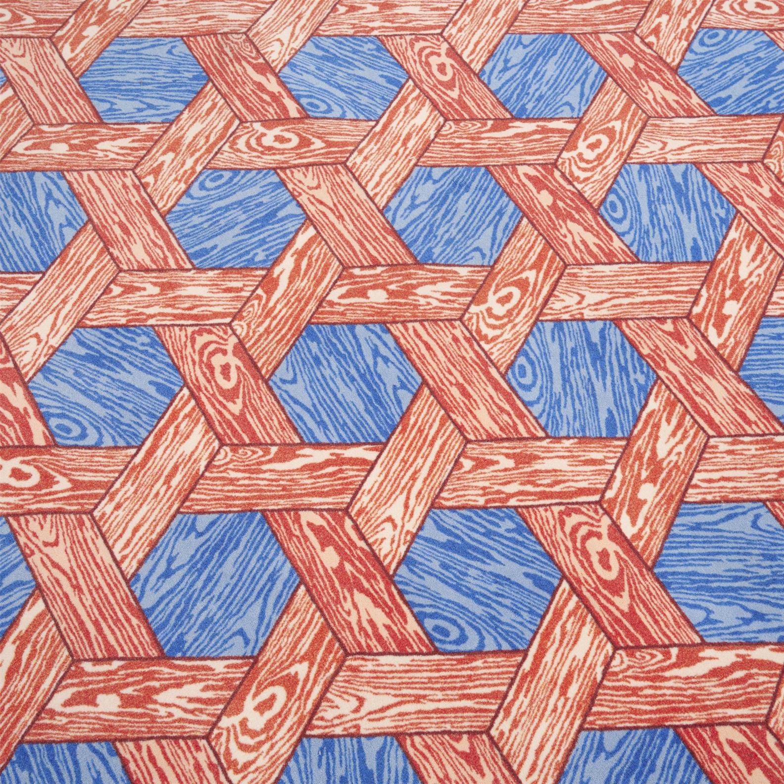 Hexagonal shape with repeating geometric faux bois pattern.
