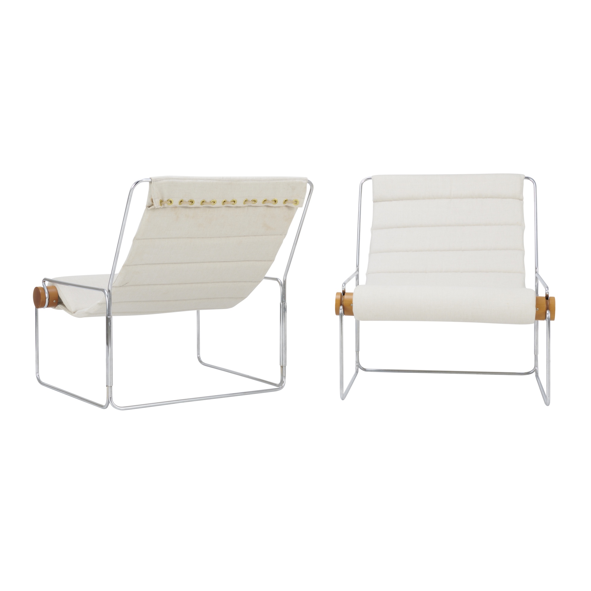 Unique folding design. Ribbed ecru coloured textile sling seat on chromed metal tube frame with large wooden dowel horizontal support.