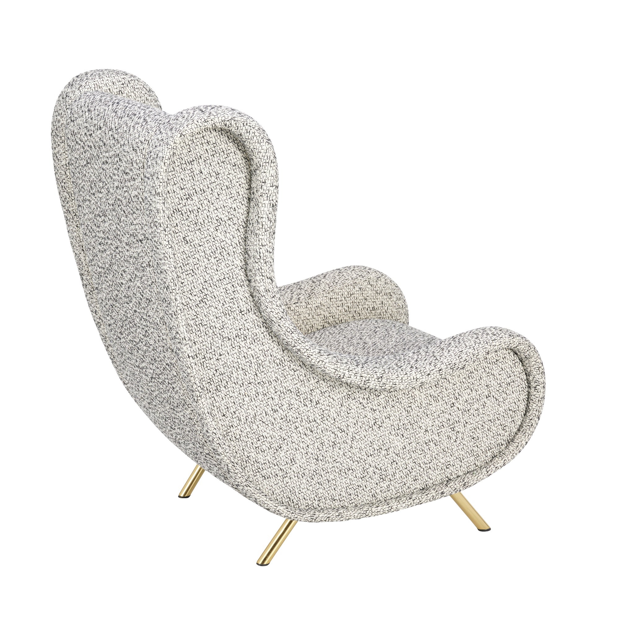High back with organic curved profile, grey textured upholstery on gold tone tubular metal legs.