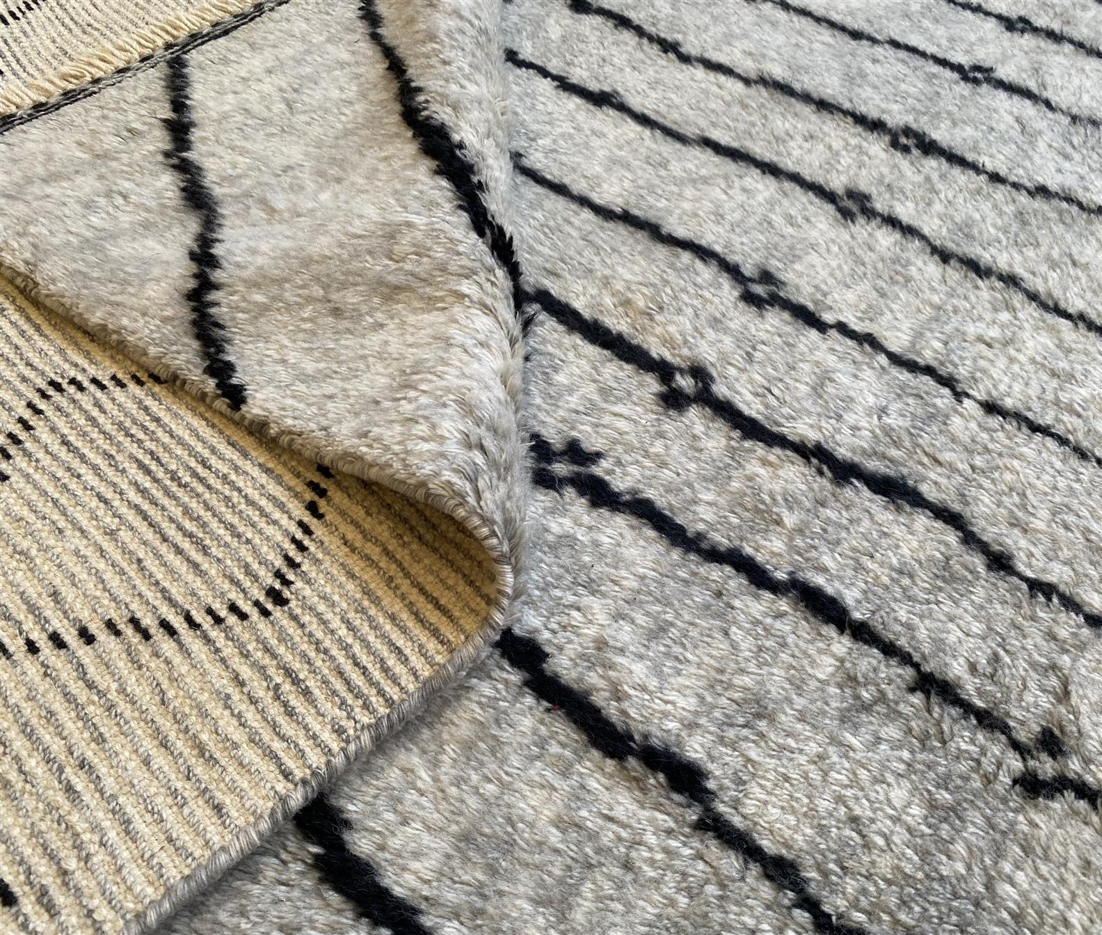 A MODERN MARRAKESH CARPET WITH 100% WOOLLEN WARP, WEFT & PILE. HAND KNOTTED. SOFT PLUSH PILE WITH GEOMETRIC PATTERNS IN ALL OVER SOFT COLOURFUL TONES. CERTIFICATE OF AUTHENTICITY & ORIGIN ON REQUEST. SIZE: 297 X 186 CM - ORIGIN: AGRA
