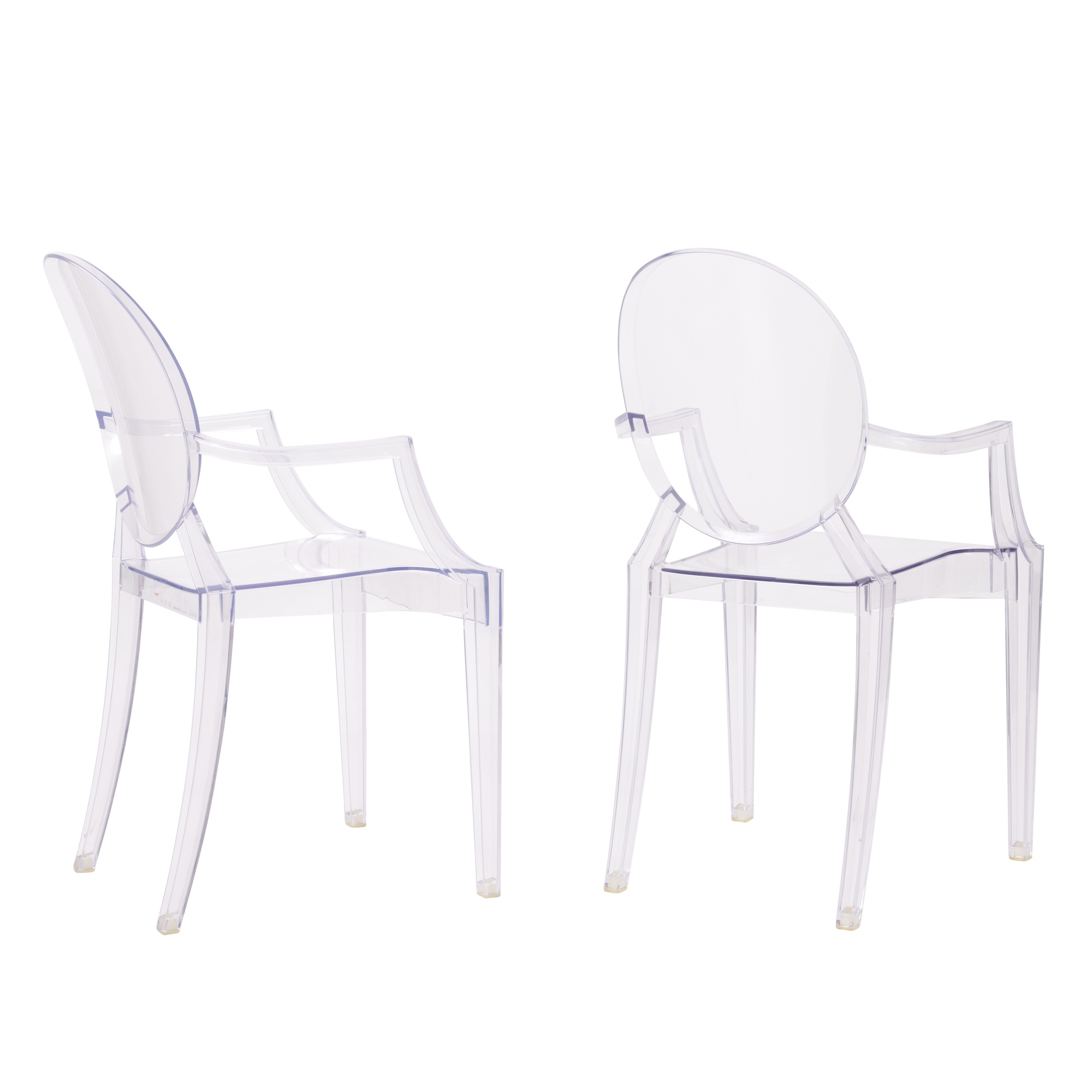 Stackable dining chair, formed and inspired by a French armchair from the era of Louis XVI. Transparent polycarbonate shell, with manufacturer's mark to rear of seat.