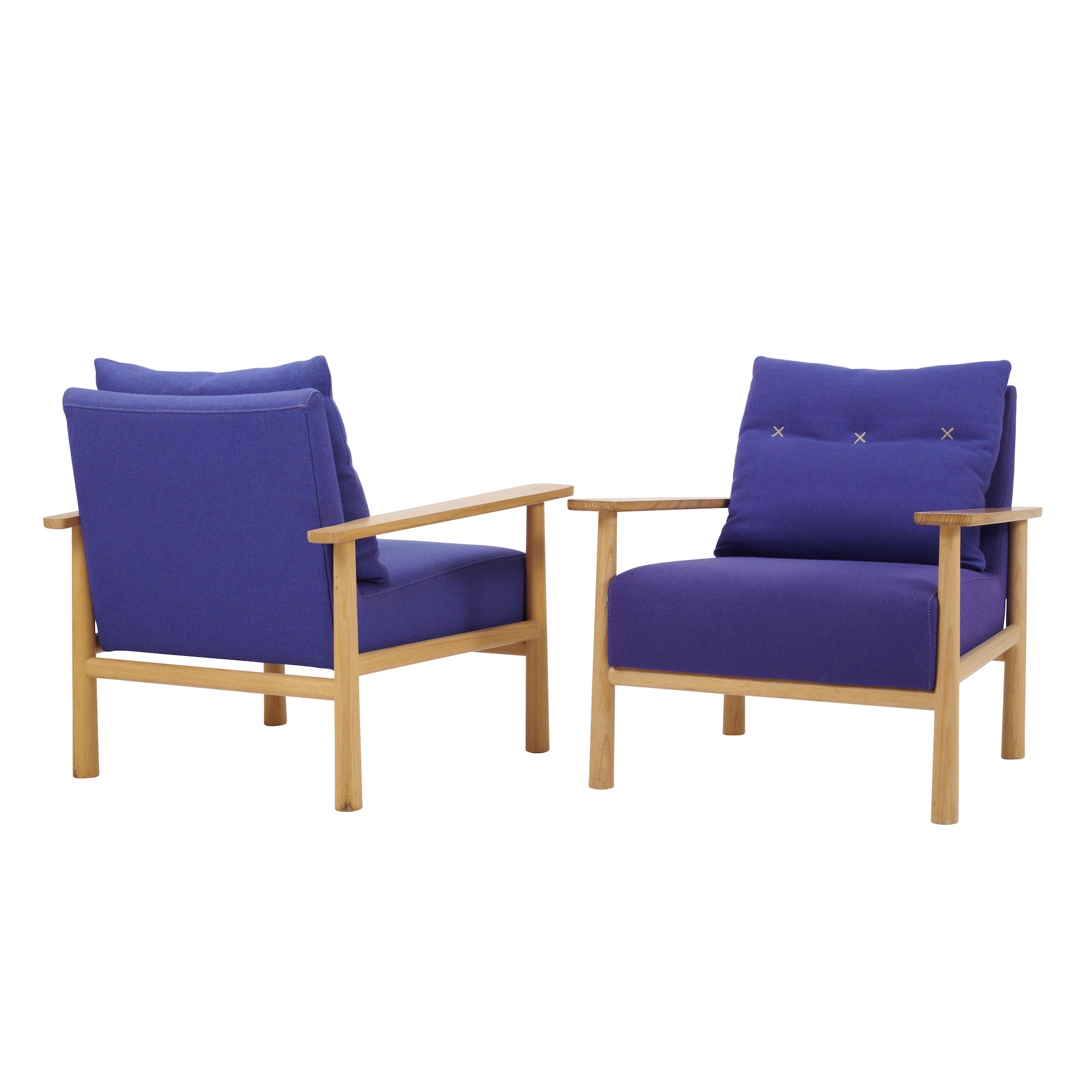 Blue violet upholstery with cross-stich detail, on solid American Oak frame.