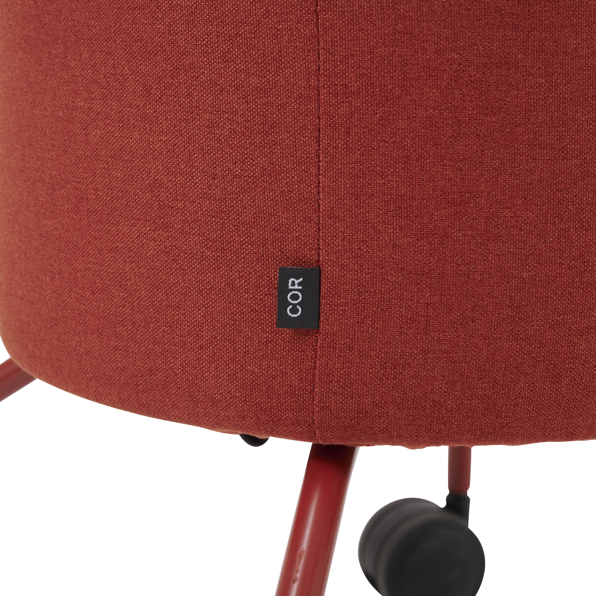 Cushioned and upholstered cylinder on coloured steel legs with castors.
