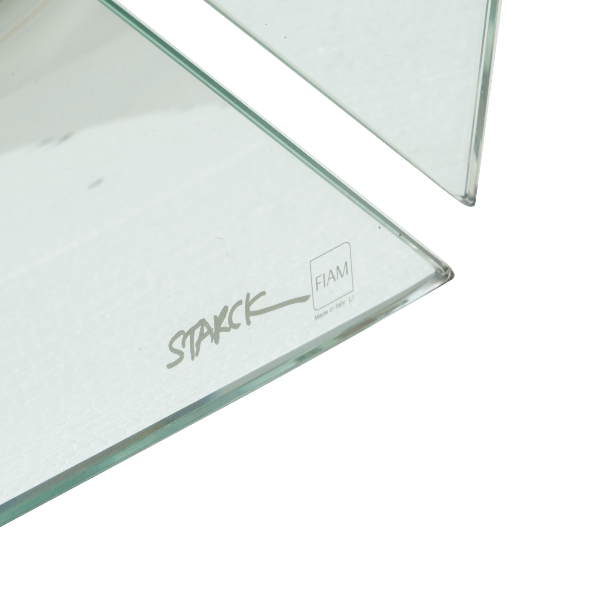 Square with four curved mirrored glass frame segments. Etched manufacturer details to frame.