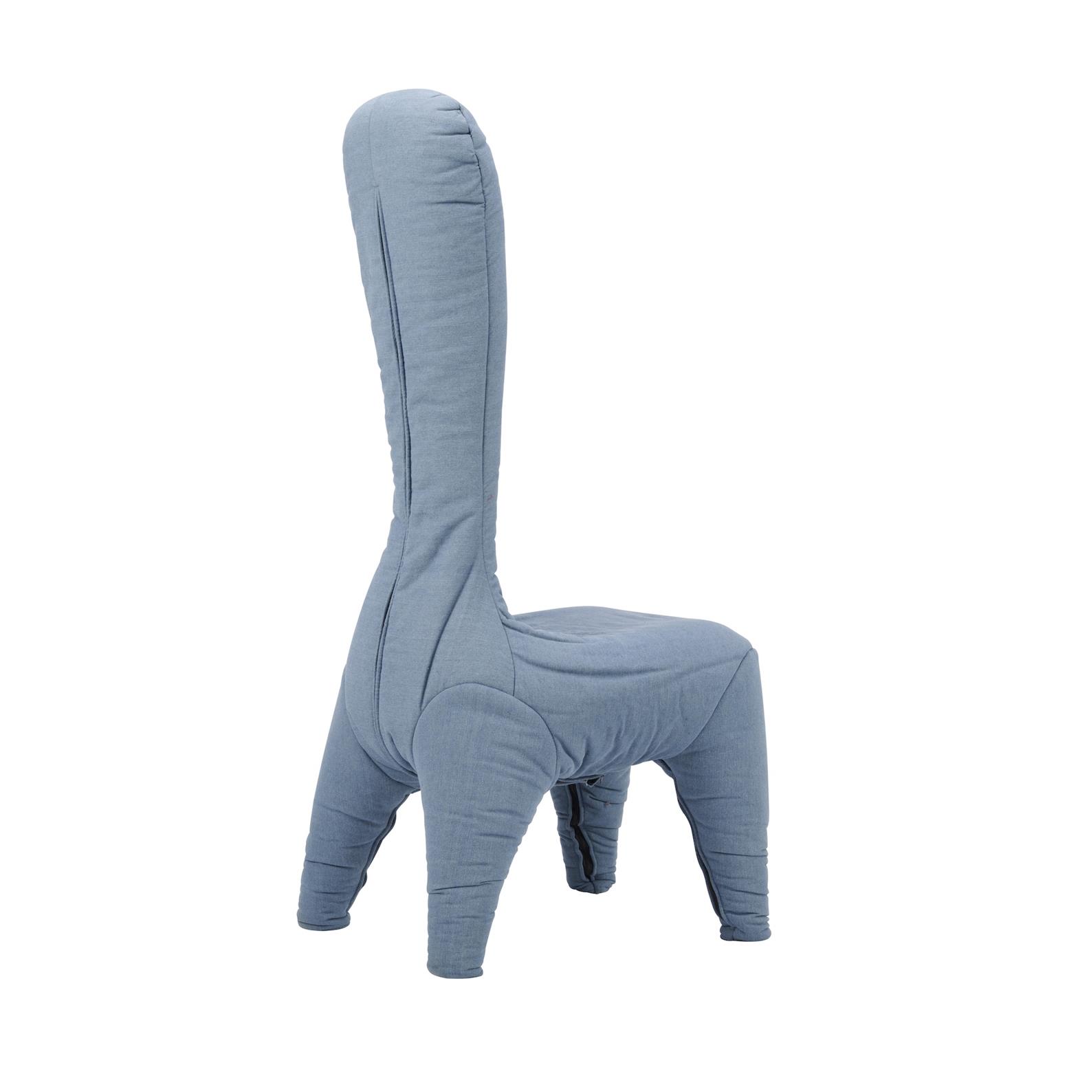 Armless, high-back chair reupholstered in denim blue.