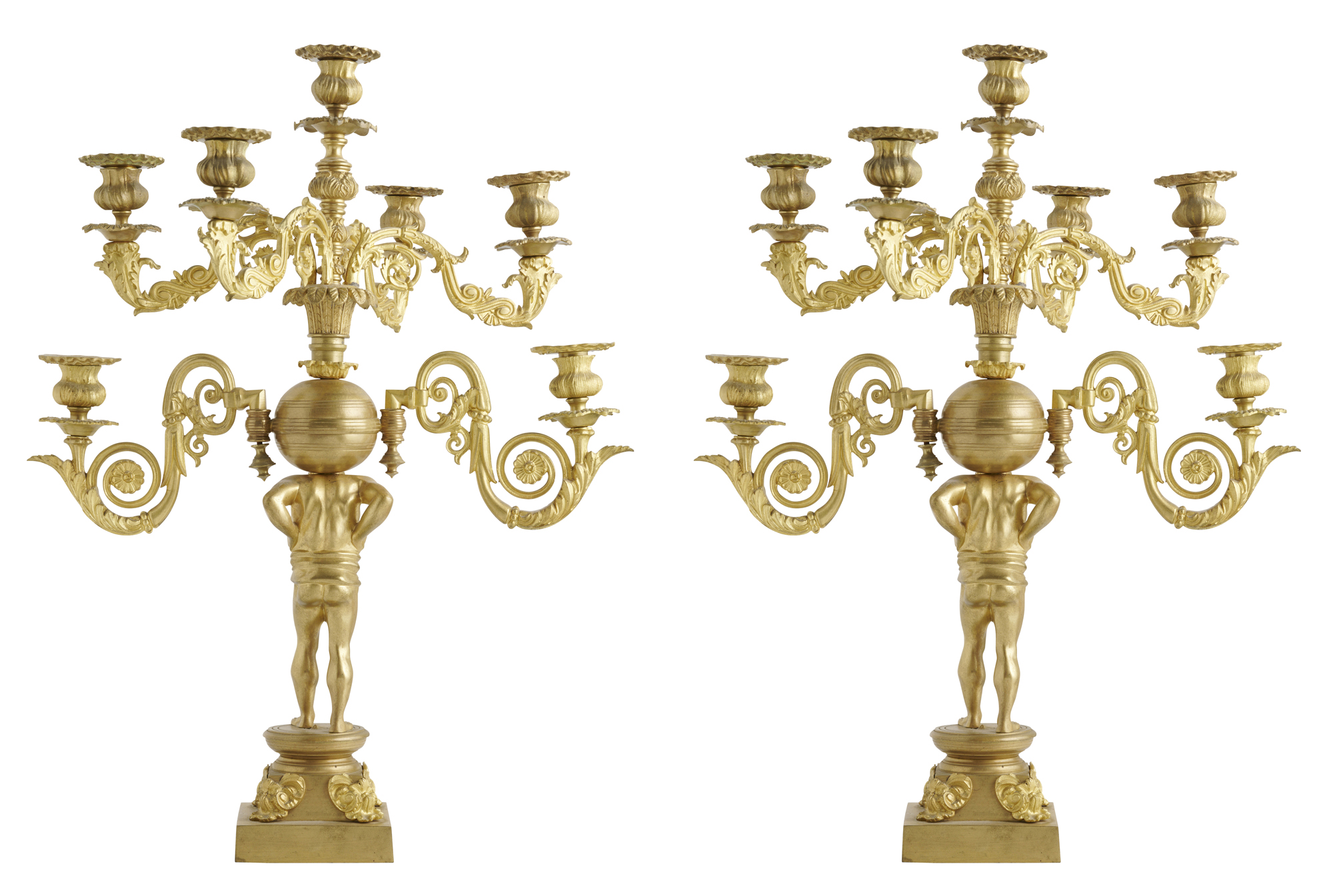 Each of seven lights arranged as a central light above a tier of four lights on foliate outswept branches with a further pair on pivoting branches below, all supported on an orb raised on the shoulders of a lightly-draped figure of Atlas standing on a stepped circular and square plinth, the tops of the pivoting branches variously impressed PP, D, and with groups of punch marks