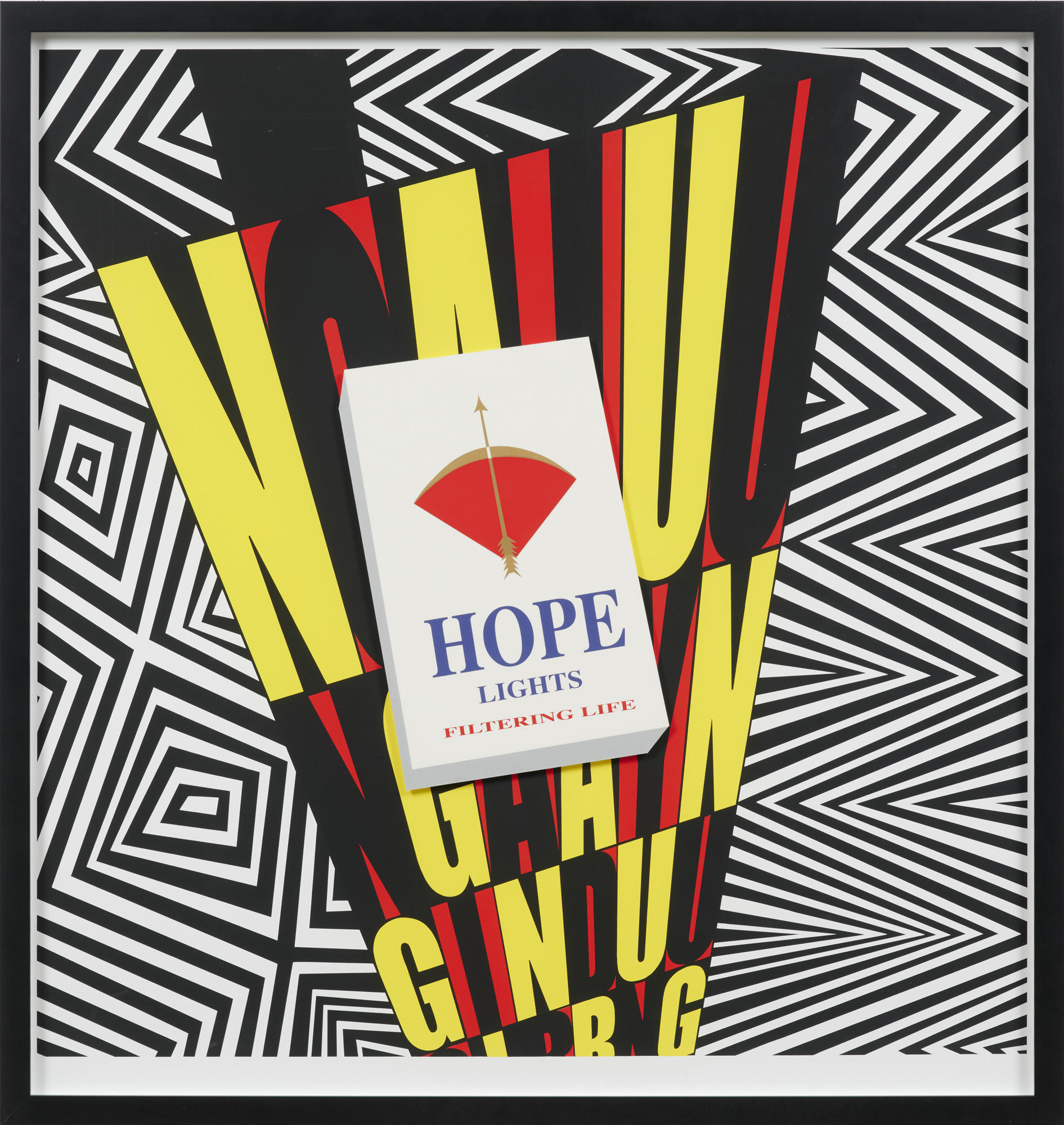 "Elements of Wiradjuri visual and spoken language intertwine to empower Andrew's Hope & Peace series of screenprints. Here slick advertising brands of cigarette packaging, chewing tobacco and chewing gum explode incongruously out of Wiradjuri texts and optical geometry in a dynamic echo of Russian Constructivism. The series unpacks contemporary global advertising by disclosing the way in which capitalist multinational corporations seduce consumers into buying the ultimate in First World consumer goods—cigarettes—through disingenuous trademarks such as ‘Peace & Hope' and ‘Frontier Lights'. Andrew also teases out the repercussions of brand names, including BlackBlack (high technical excellent flavour) and Black & White Special Cut, which serve to commercialise and glamorise at the same time as obfuscating difference." (exhibition excerpt, Geelong Gallery, Victoria)