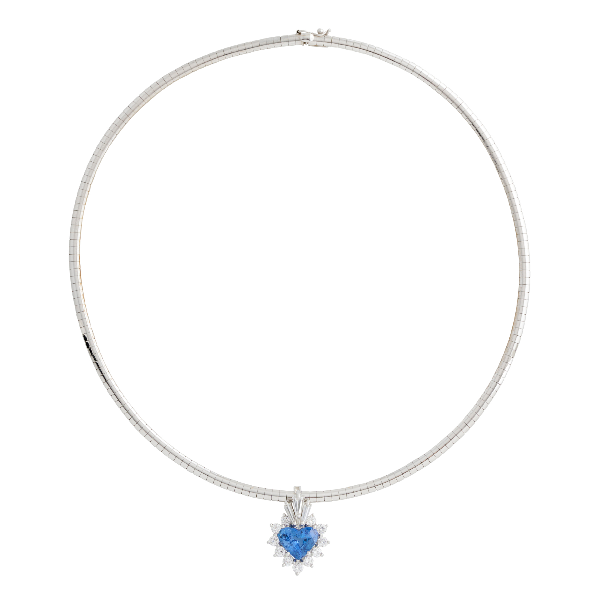 Featuring a pendant of cluster design, centring a claw-set heart-cut sapphire weighing approximately 2.20 carats within a surround of claw-set brilliant-cut diamonds to a tapered baguette-cut diamond surmount, the diamonds together weighing approximately 0.70 carats, suspended from a omega collar completed by a box clasp, pendant length 22mm, width 15mm, collar length 410mm, gross weight approximately 25.5 grams