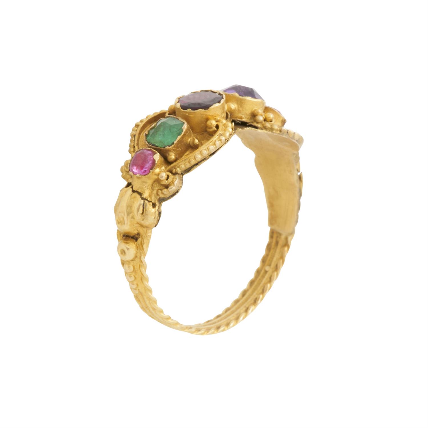 Set with a row of collet set gems; a ruby, emerald, garnet, amethyst, ruby and diamond, to a decorative surround, size M 1/2, 1.71 grams, accompanied by an antique box