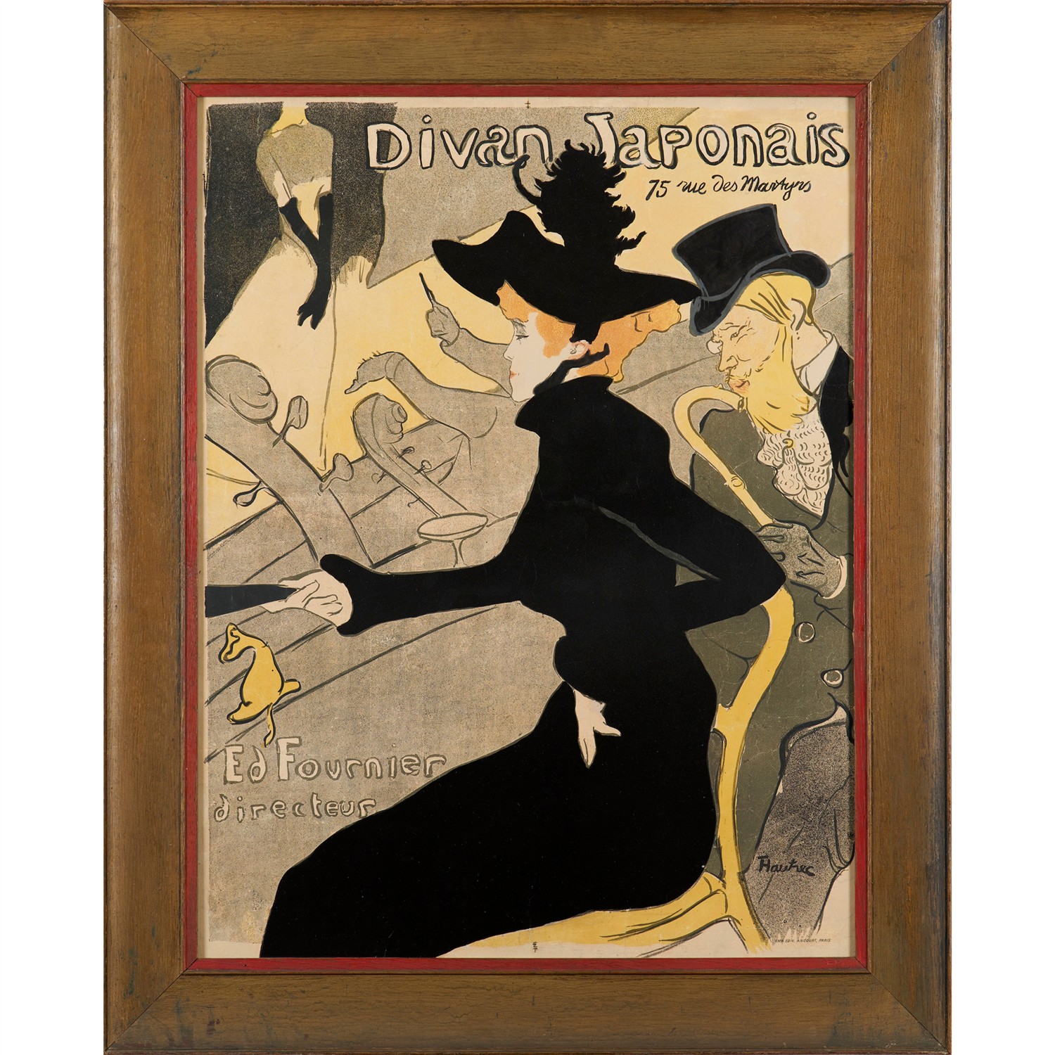 Divan Japonais was one of the many café-concerts in late nineteenth-century Paris frequented by Toulouse-Lautrec. His lithograph advertising the nightspot features two of his favourite Montmartre stars, Yvette Guilbert and Jane Avril. Here, Avril is a spectator, not a performer, as she sits in the foreground with Édouard Dujardin, a dandyish writer and nightclub habitué. In the upper left corner, on stage, is the headless body of Guilbert, recognisable by her trademark long black gloves and gaunt physique.