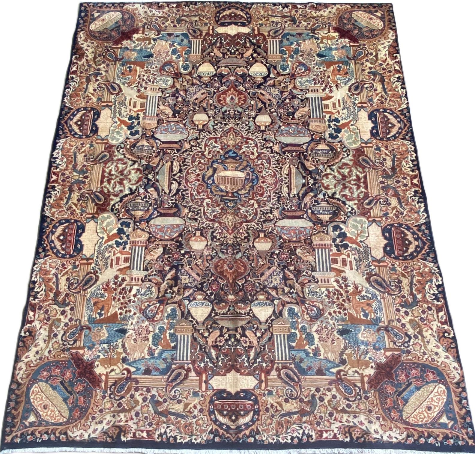 GALLERY EXHIBITED. SOLID & PLUSH WOOL PILE. HAND-KNOTTED CITY WEAVE FROM THE NORTH-EASTERN KHORASAN PROVINCE WITH CENTRAL MEDALLION CONTAINING AN EXCAVATED URN IN AN INDIGO FIELD PF SYMMETRIC URNS, PILLARS & PHEASANTS. CORNER MEDALLIONS CONTAINING DEER, GOATS, SWANS & FLORAL SHRUBS. ELABORATE BORDER OF URNS, FLORAL SPRAYS, PHEASANTS AND PAISLEY MOTIFS.