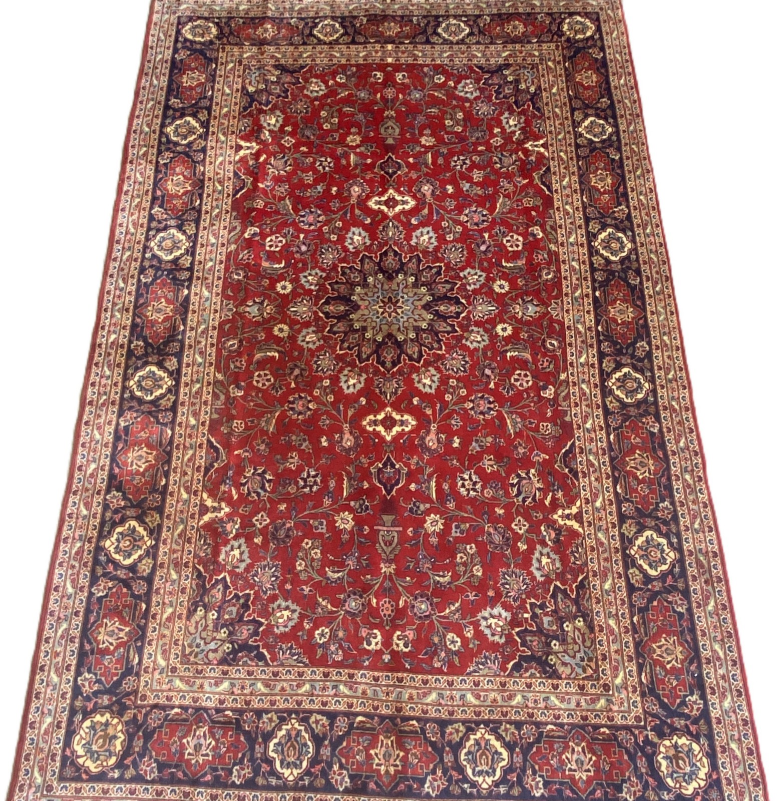 FINE HIGH-QUALITY WOOL PILE. GALLERY EXHIBITED. FINELY HAND-KNOTTED CITY WEAVE FROM NORTH ISFAHAN PROVINCE WITH RARE KASHAN DESIGN OF A SUNBURST MEDALLION OF PALMETTES & QUARTERED CORNER MEDALLIONS IN A RUBY RED FIELD OF SHAH ABBASSI PALMETTES & BLOSSOMING FLORAL SPRAYS IN SHADES OF CREAM, INDIGO & CORNFLOWER BLUE. UNIQUE BORDER OF CARTOUCHES CONTAINING PALMETTES & FLORAL WREATHS.