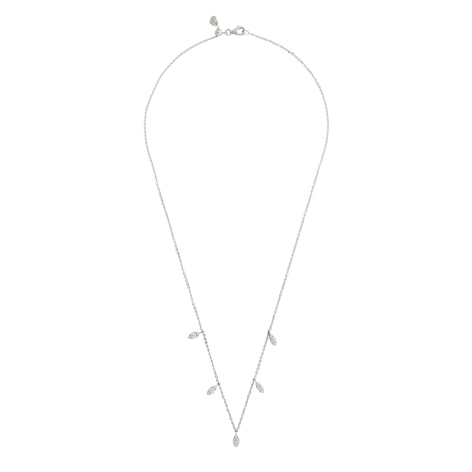 Modelled as a fine trace chain suspending five marquise drops, each detailed with three round brilliant-cut diamonds, completed by a parrot clasp, length 440mm, gross weight approximately 3.4 grams.