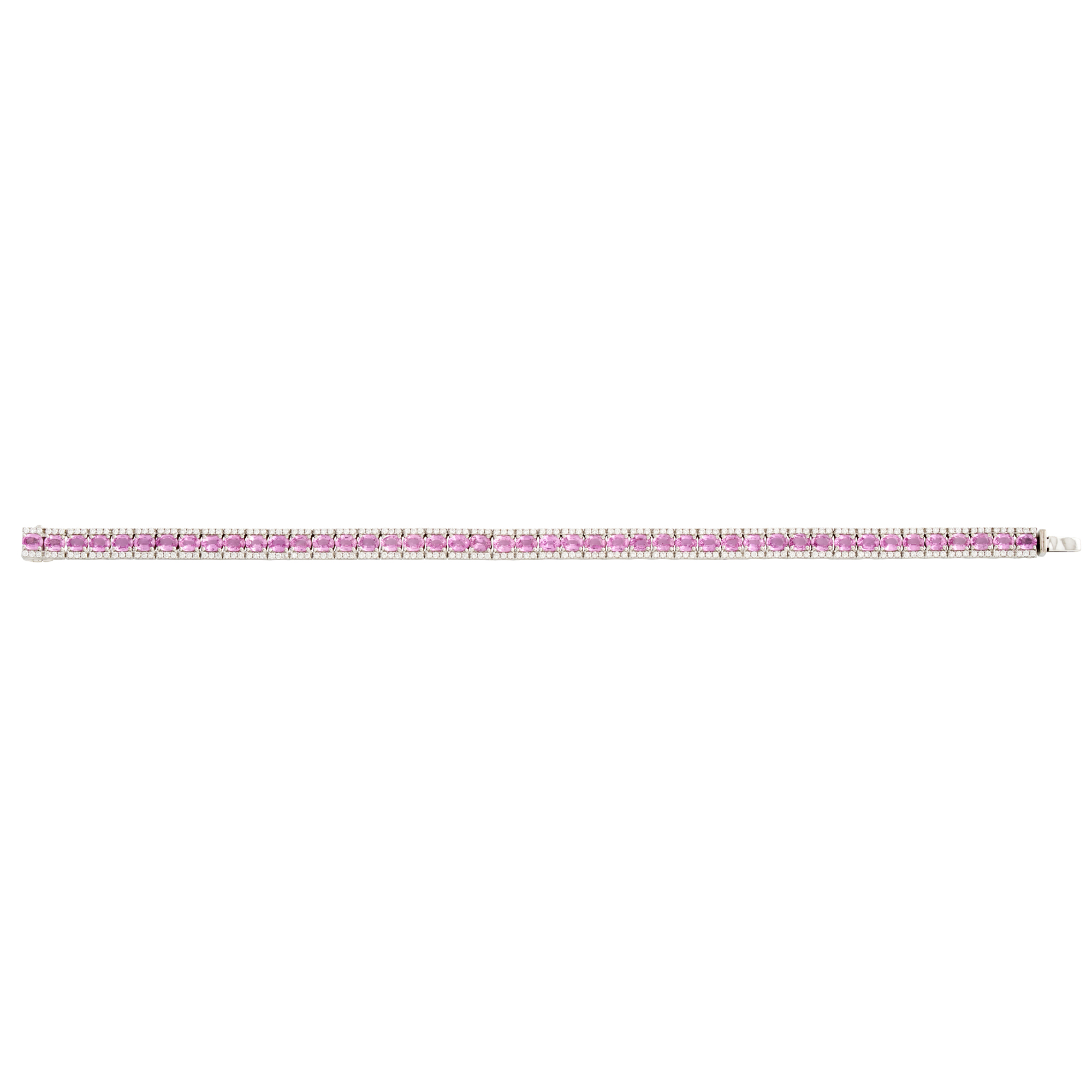 Modelled as a continuous line of articulated links, each centring a claw-set oval-cut pink sapphire framed by six brilliant-cut diamonds, the sapphires together weighing approximately 5.00 carats, the diamonds together weighing approximately 1.70 carats, completed by a concealed box clasp, signed HB for Hardy Brothers, length 195mm, gross weight approximately 19.6 grams.