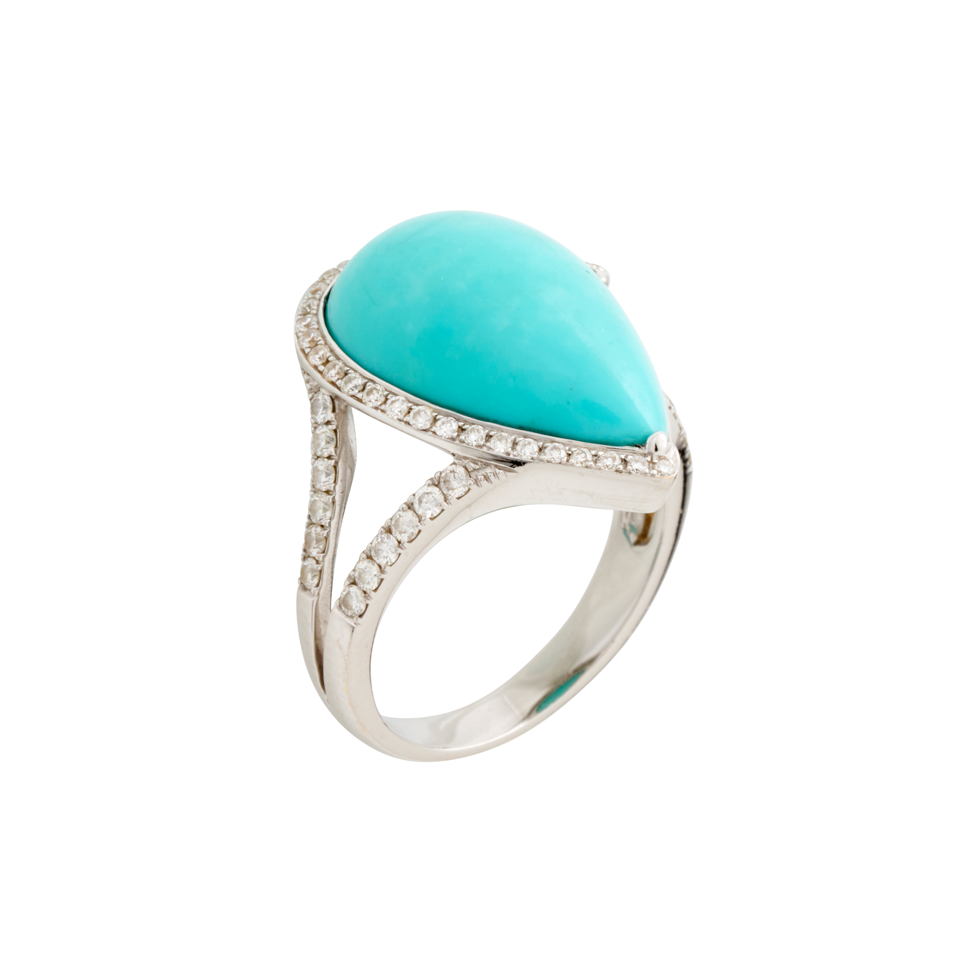 Centring a pear-shaped cabochon turquoise weighing approximately 9.56 carats, within a single-cut diamond surround and diamond set shoulders, size L, gross weight approximately 7.59 grams.