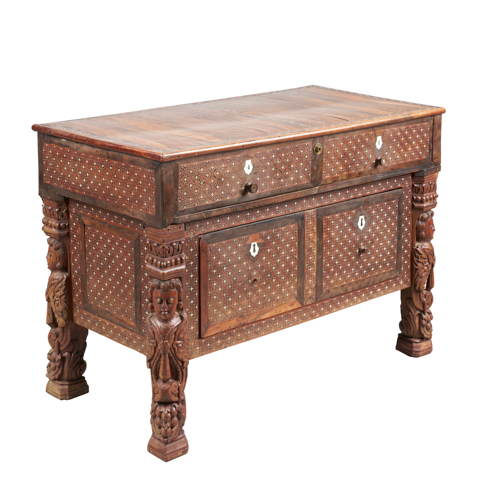 Originally supporting an upper cabinet, now with a rosewood top above a frieze drawer covered with an internal velvet-lined brushing slide, a further deep drawer below, on caryatid supports at all corners, the front and sides inlaid with a repeating encircled star design in contrasting woods and ivory, the top and present configuration of the frieze drawer dating to the conversion circa 1830